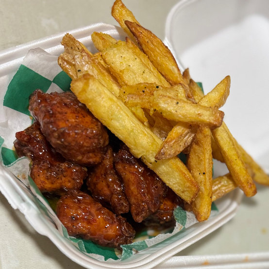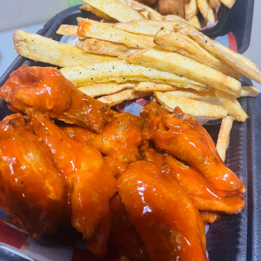 6 pz de alitas en la salsa a elegir, acompañados de papas a la francesa caseras y aderezo ranch