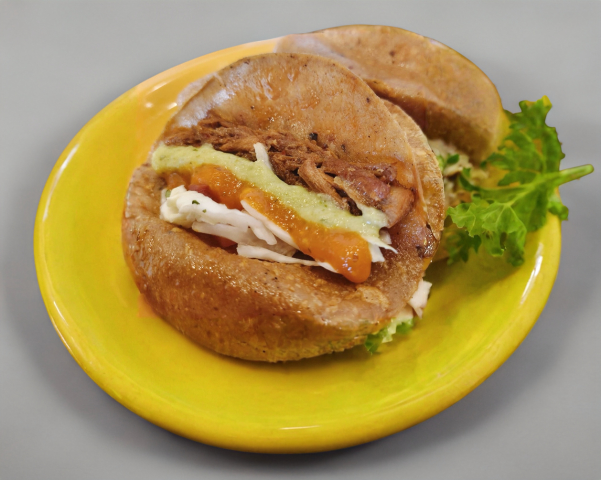 Tortilla de maíz rellena de chicharrón prensado de puerco guisado con el toque especial de la casa.