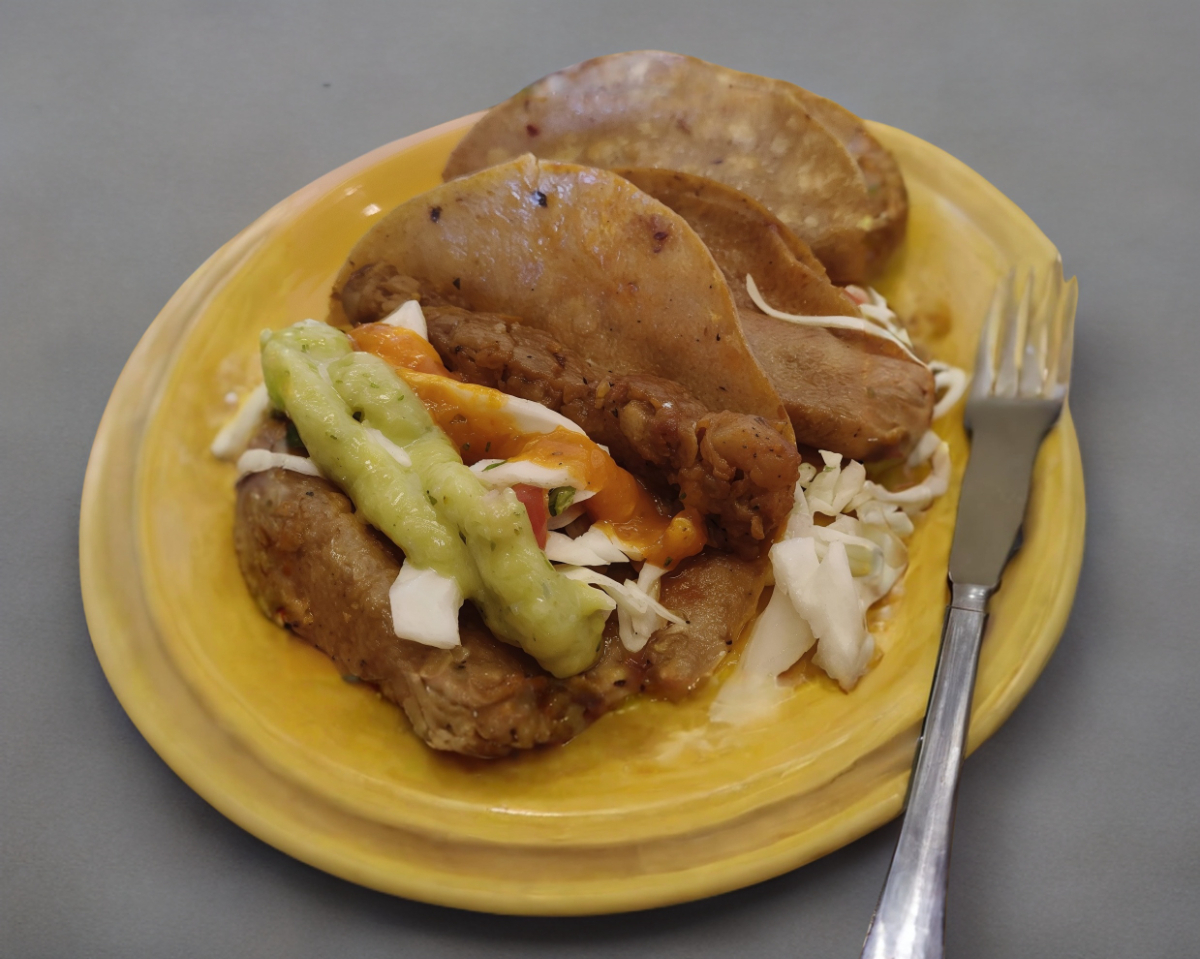Tortilla de maíz rellena frijol guisado con manteca y nuestro delicioso mejunje especial de la casa.