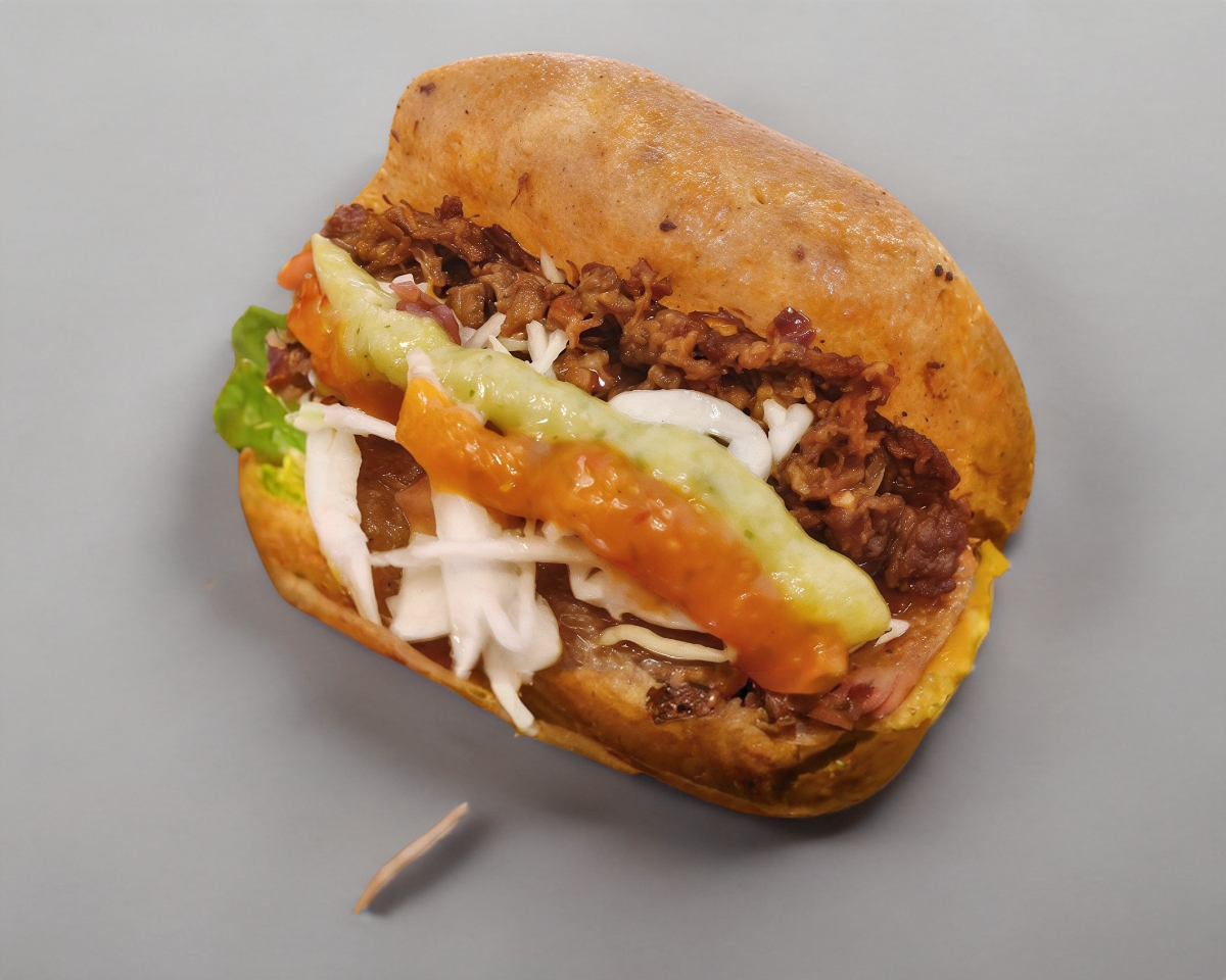 Tortilla de harina rellena con carnitas hechas en casa guisada con nuestro delicioso mejunje especial.
