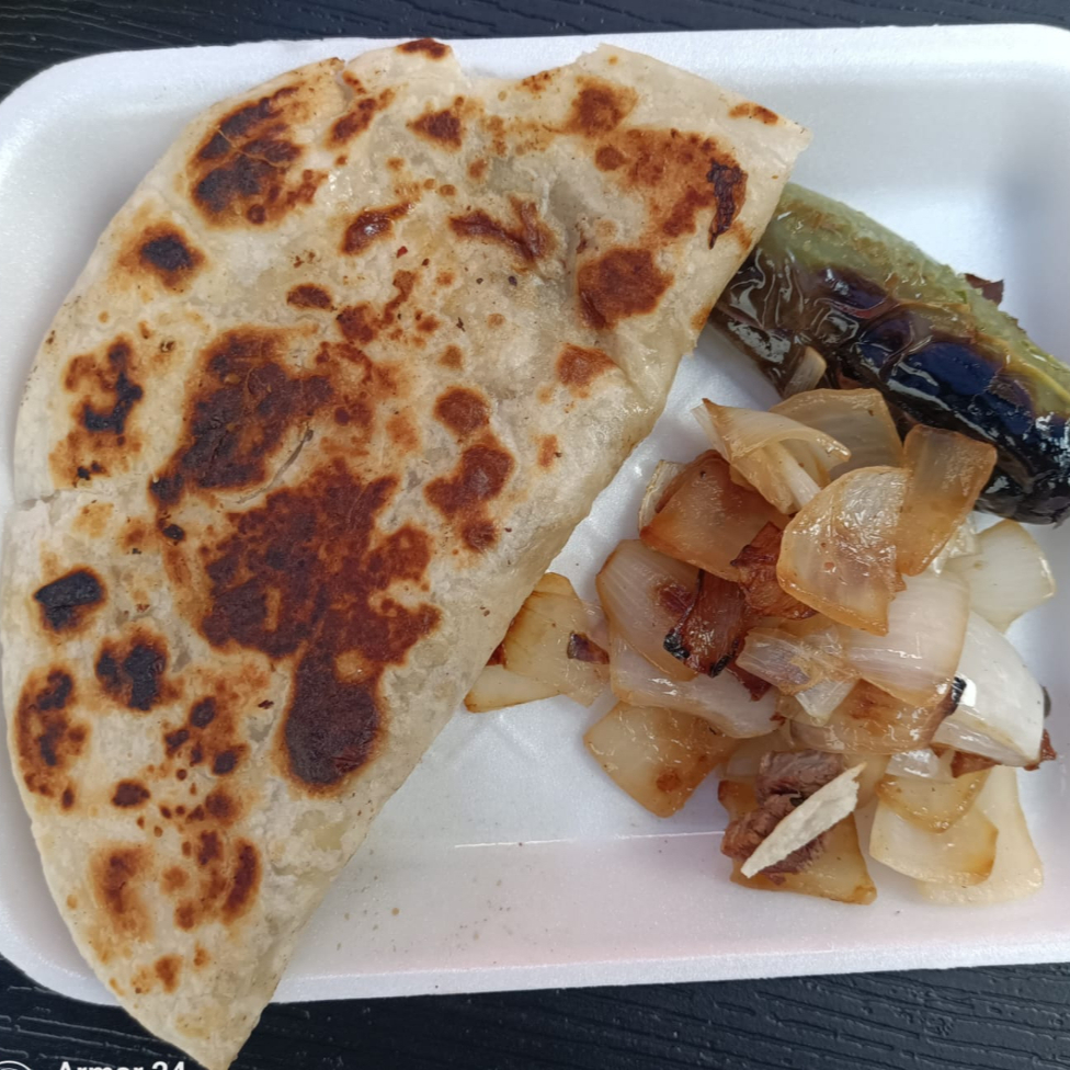 tortilla de harina de 20 cm rellena con delicioso queso manchego 100% de leche y carne de sirlon finamente picada acompañado de cebollitas asadas y chile toreado