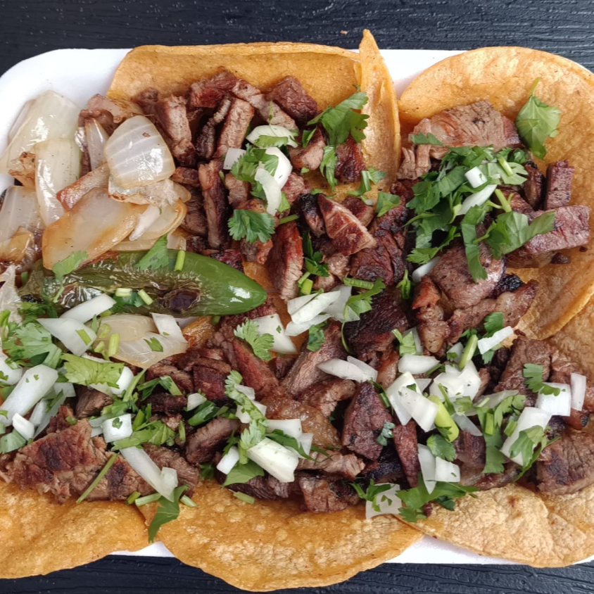 deliciosa carne de sirlon en una cama de 5 tortillas de maiz amarillo con cebollitas asadas y chile toreado