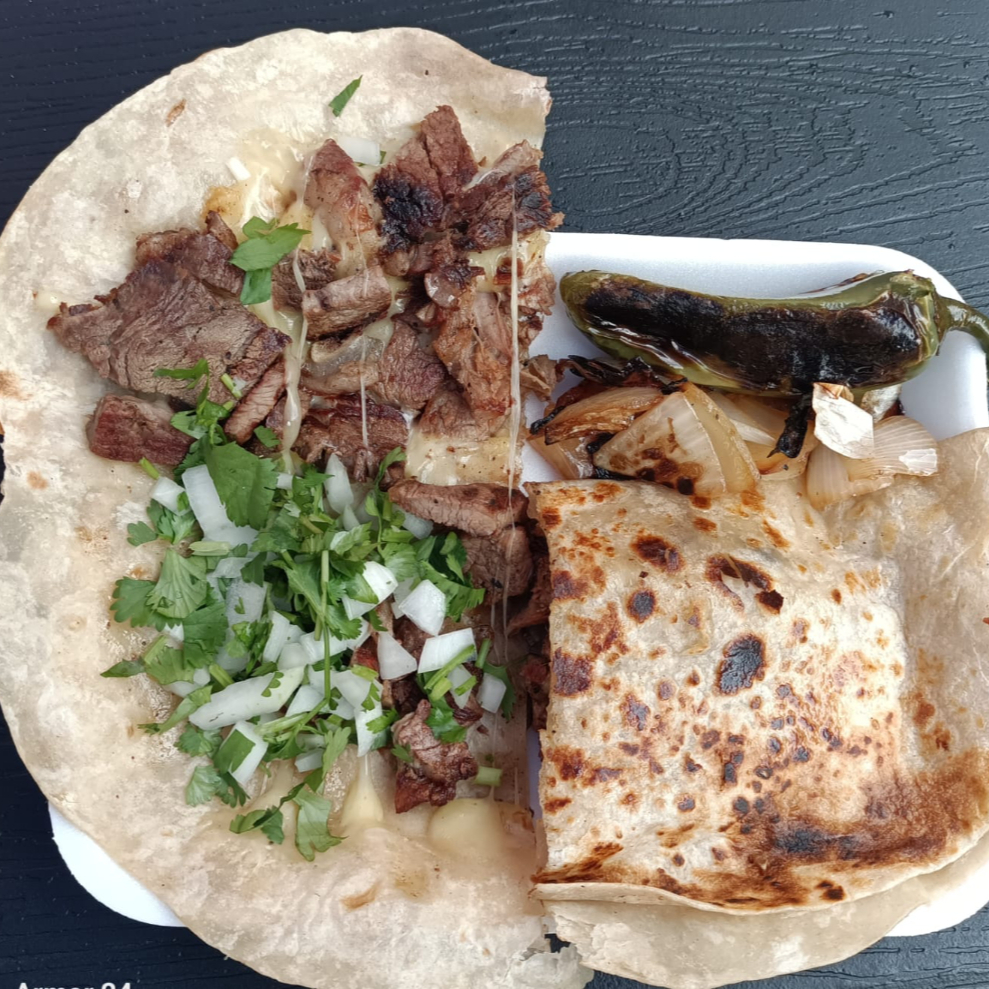 tortilla de harina de 30 cm rellena con delicioso queso manchego 100% de leche y carne de sirlon picada acompañado de cebollitas asadas y chile toreado