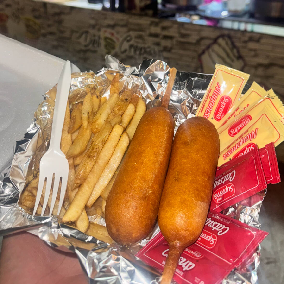 Hot dog con salchicha de pavo, aderesos, papas y refresco.