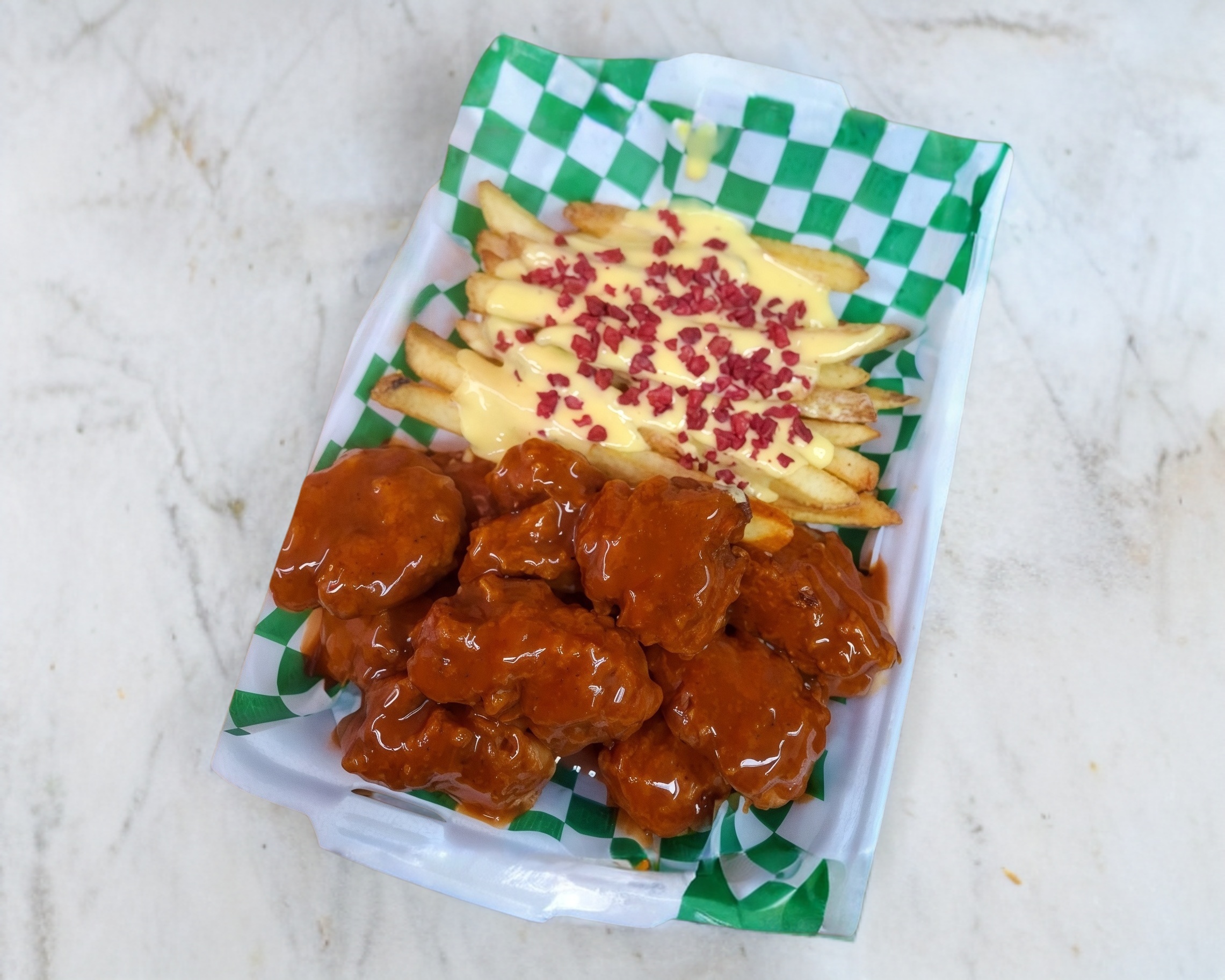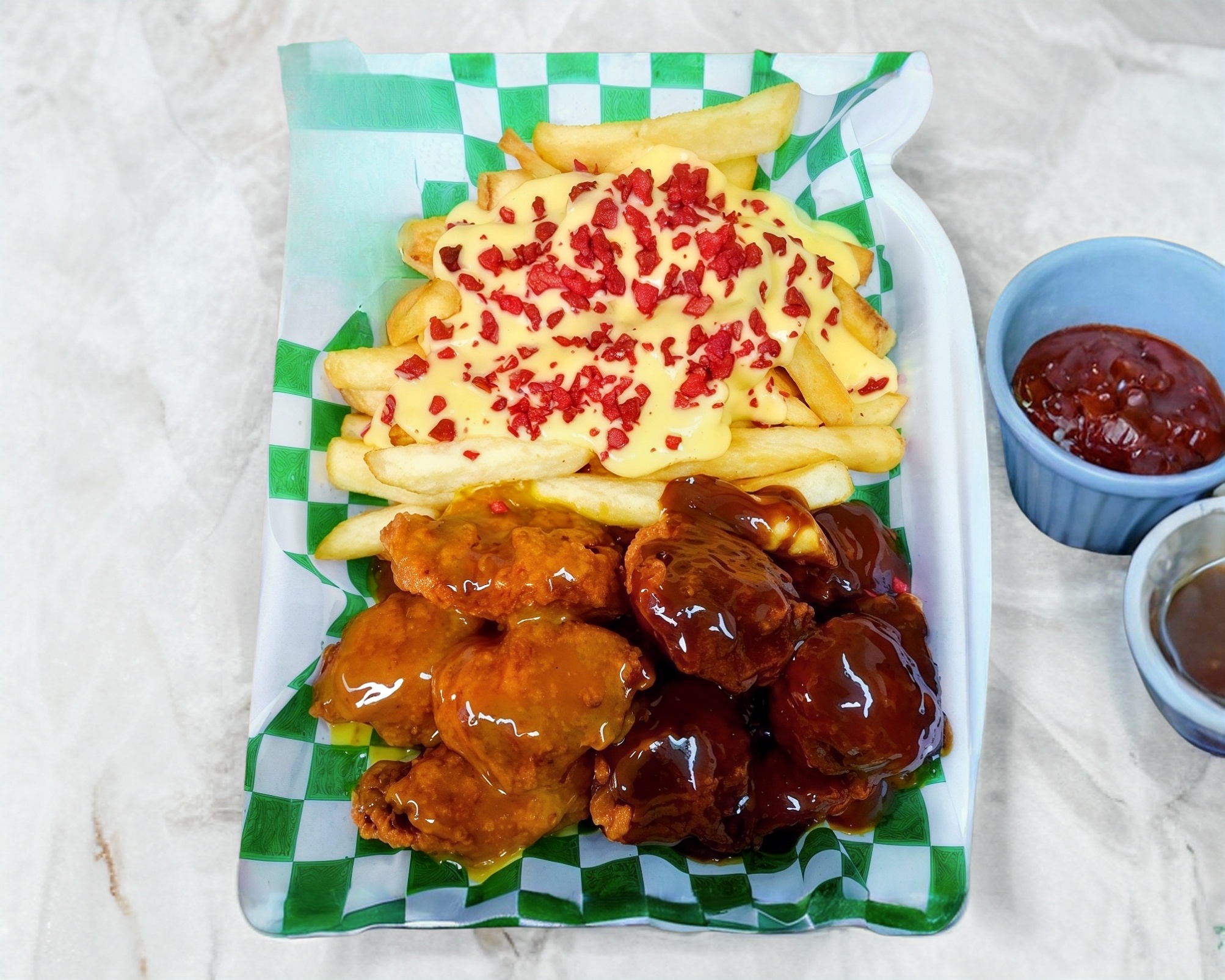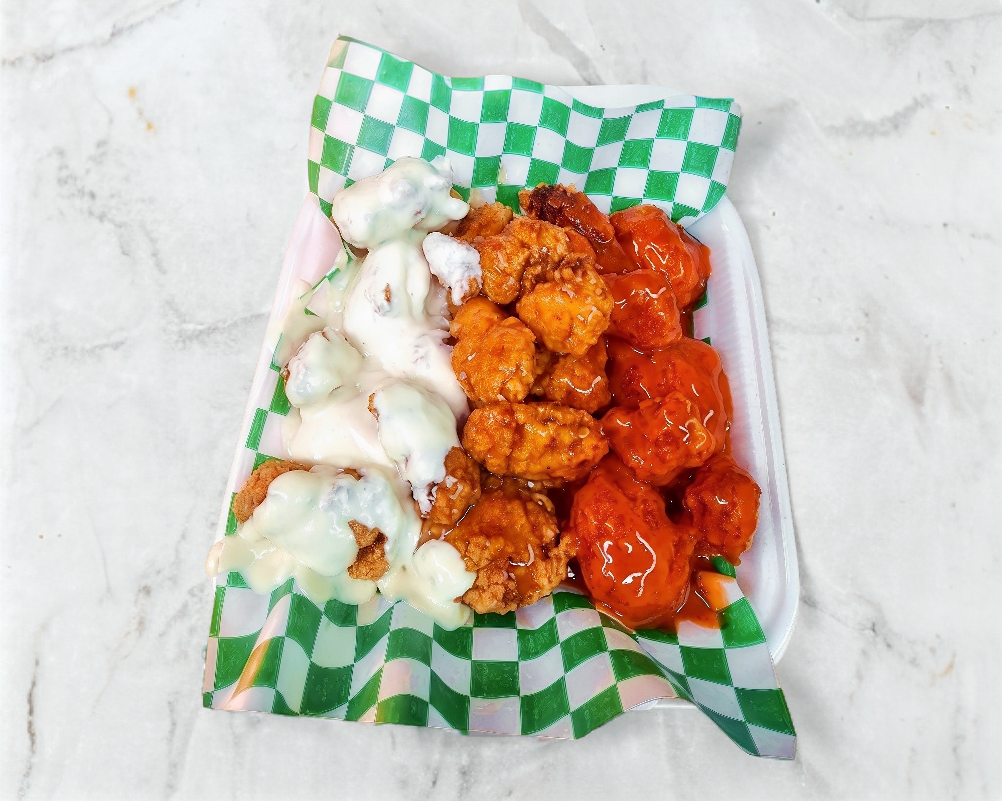 Boneless 1 kilo + Orden de PaPas- INCLUYE, 1 o 2 de las Deliciosas Dino Salsas a Elegir Para tus Boneless, Queso cheddar y Tocino Deshidratado en las Papas, màs Aderezo Ranch.
