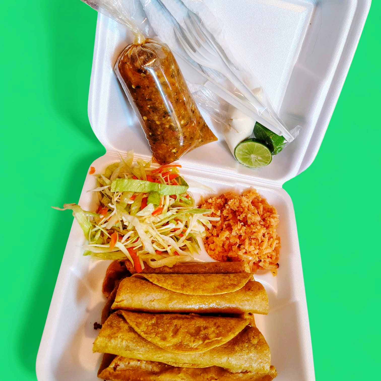 Taquitos tipo Flautas de Picadillo (5) con Arroz Lechuga y Salsa de chicharron . + Refresco