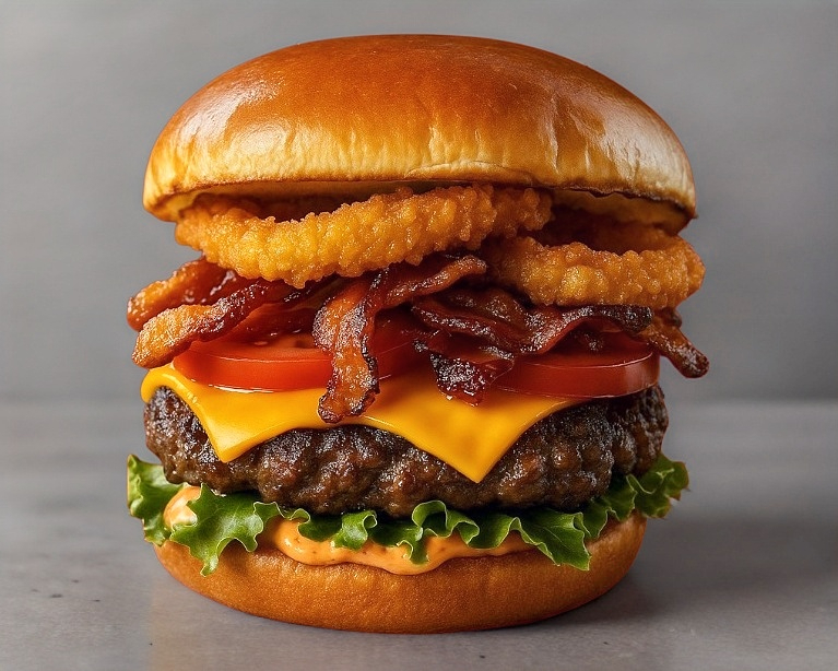 Deliciosa Hamburguesa 100% carne de res, aros de cebolla, BBQ, tocino y cebolla caramelizada, queso cheddar y aderezo especial. Incluye papas a la francesa