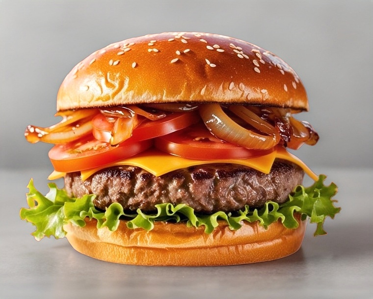 Deliciosa hamburguesa 100% carne de res, lechuga, tomate, queso cheddar, tocino y cebolla caramelizada y nuestro aderezo especial.