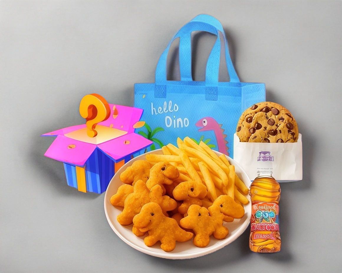 *Bolsita dino *Platillo Kids a escoger *Jugo 300mL *Galleta chispas de chocolate *Juguete Sorpresa.