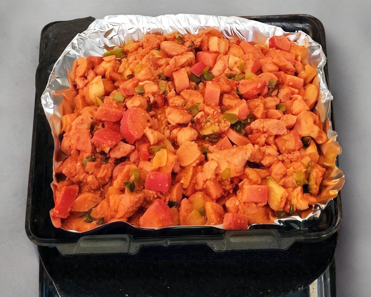 Carne de res, carne de puerco, salchicha roja, salchicha viena, tocino, chorizo, cebolla, chile morrón, tomate y cilantro. Pensado para 12 personas aproximadamente.