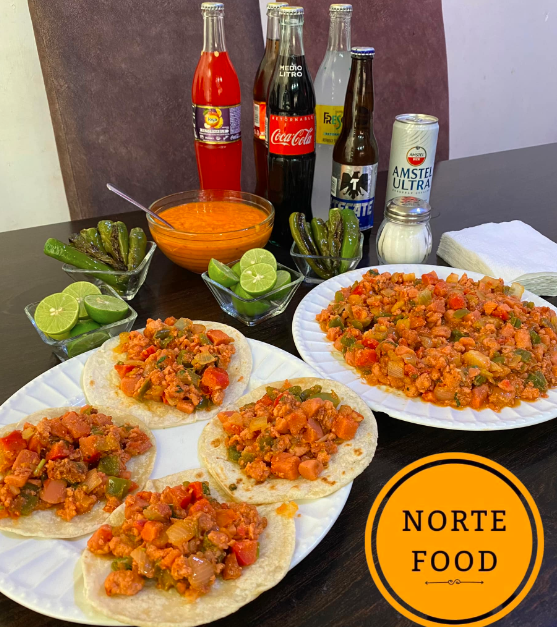 Carne de res, carne de puerco, salchicha roja, salchicha viena, tocino, chorizo, cebolla, chile morrón, tomate y cilantro.