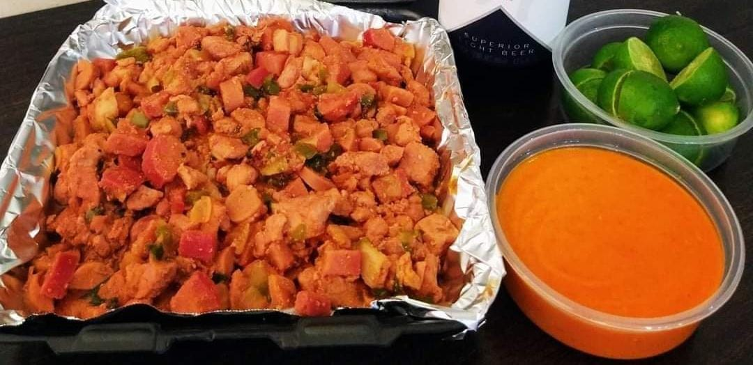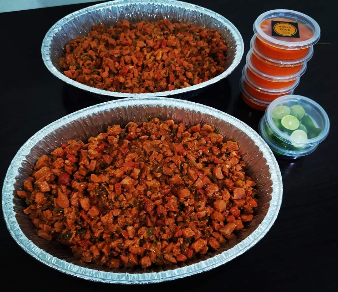 Carne de res, carne de puerco, salchicha roja, salchicha viena, tocino, chorizo, cebolla, chile morrón, tomate y cilantro. Pensado para 12 personas aproximadamente.