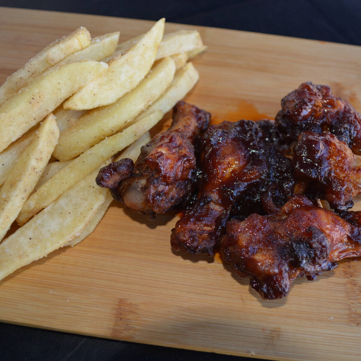 Clásicas, jugosas y llenas de sabor 🔥. Cinco alitas bañadas en nuestra deliciosa salsa BBQ, con ese toque dulce y ahumado que las hace irresistibles 🤤. Acompañadas de papas fritas doraditas para completar el antojo perfecto 😎.