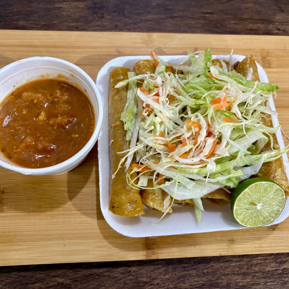 Deliciosos taquitos al vapor de carne y papa, acompañado de deliciosa salsa de chicharrón, verdura y limón