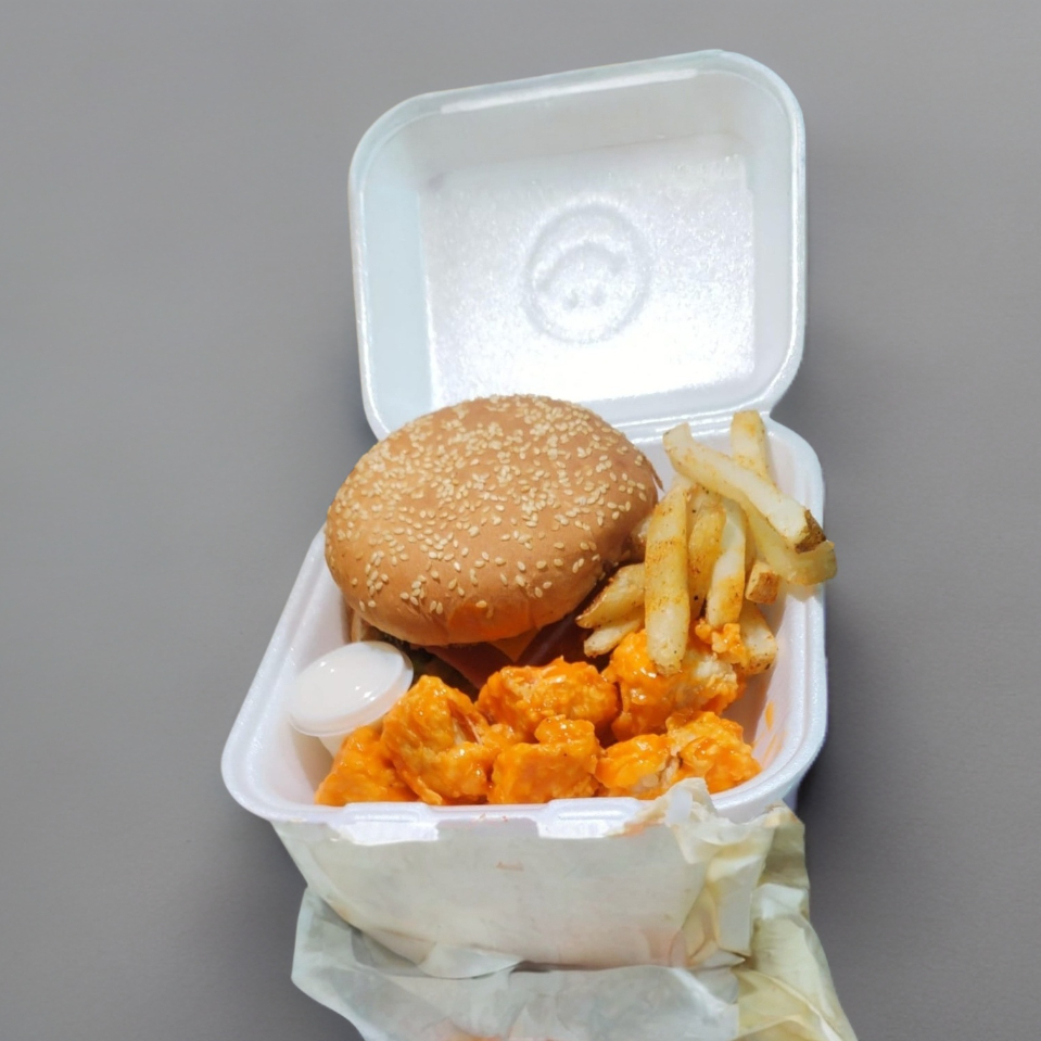 Hamburguesa sencilla, 6 boneless, papas y refresco 400ml.