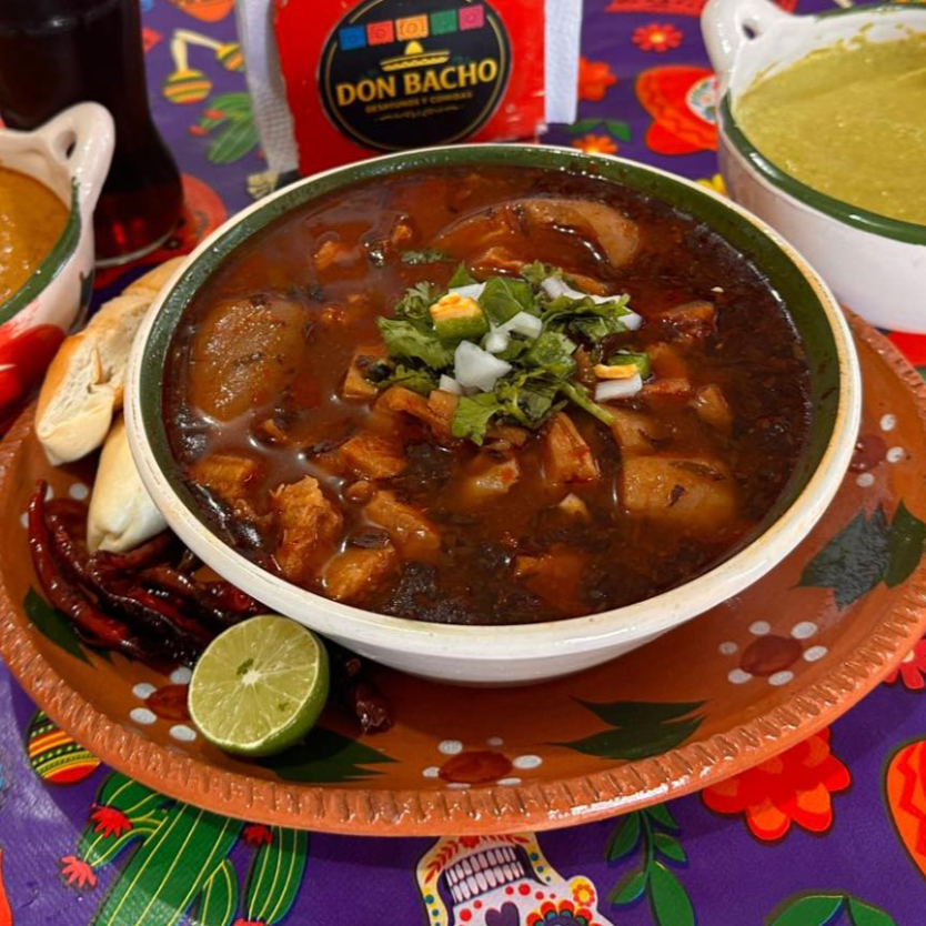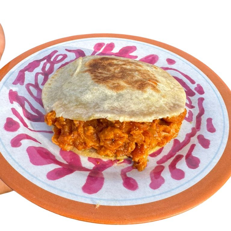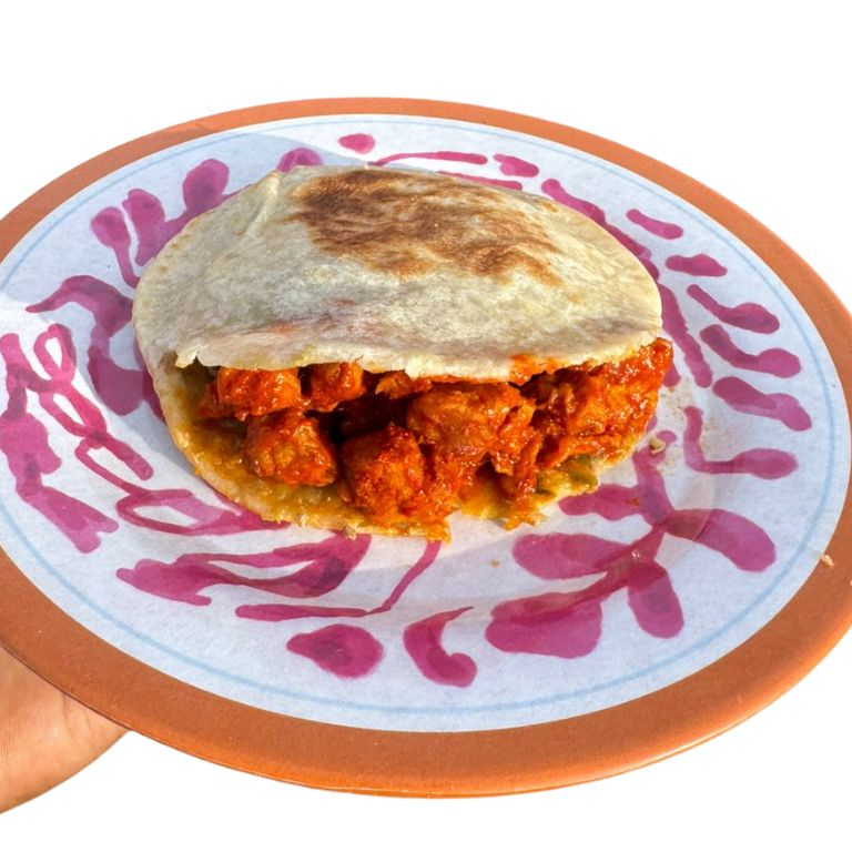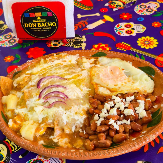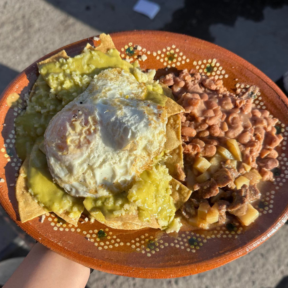 Chilaquiles salsa mixta no muy picante, acompañados con huevo estrellado o pollo, un guiso y frijoles refritos o en bola.
