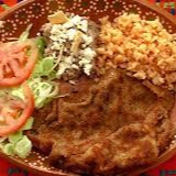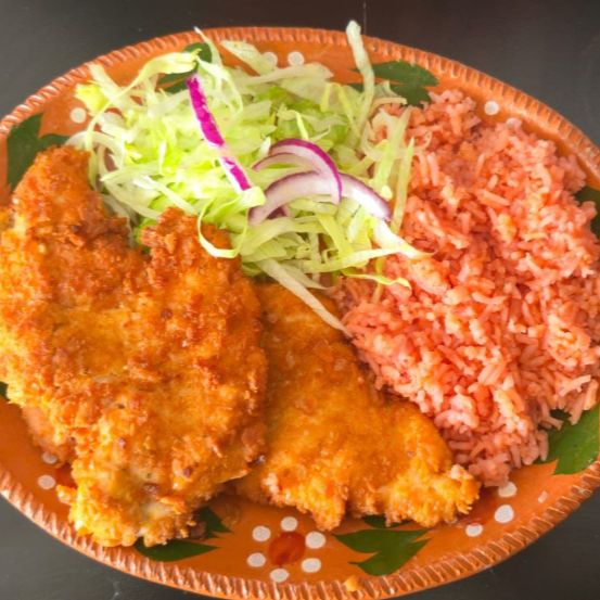Milanesa de res empanizada, acompañada de arroz, tortillas y ensalada