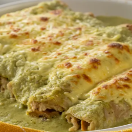 Enchiladas suizas de pollo en salsa verde cremosa, con queso, crema acompañada de frijoles refritos o arroz