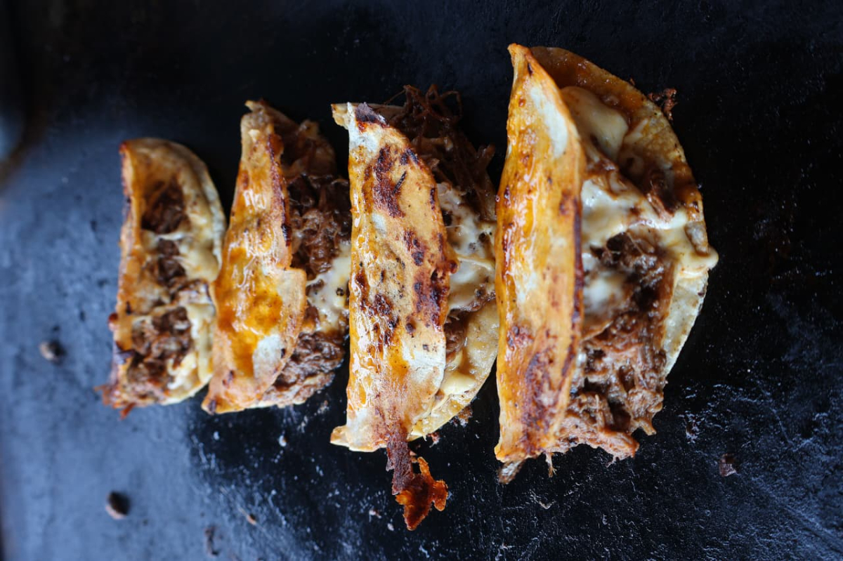 Mucha Birria en una costra de queso crujiente