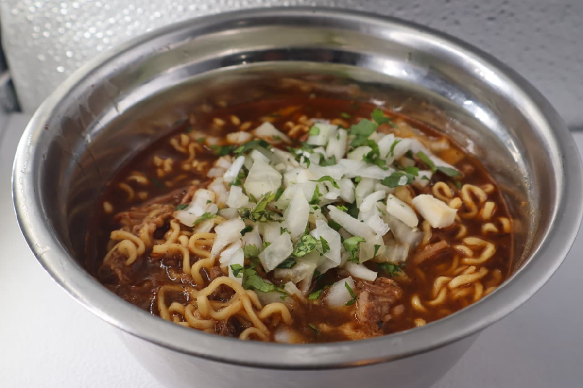 Ramen cocido en consomé de Birria con carne y queso derretido, ideal para la cruda!
