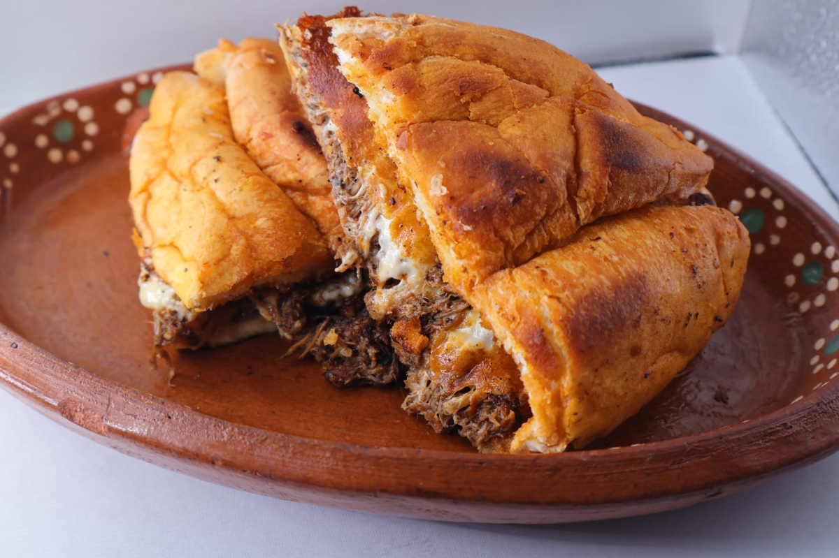 Delicioso pan francés doradito con mucha Birria jugosita y queso gratinado