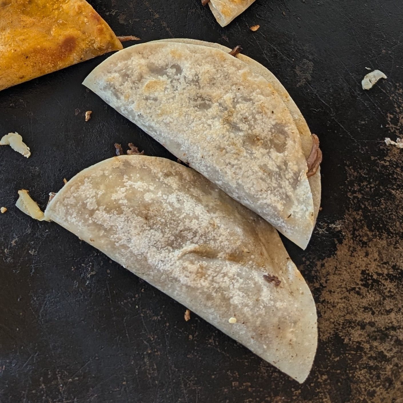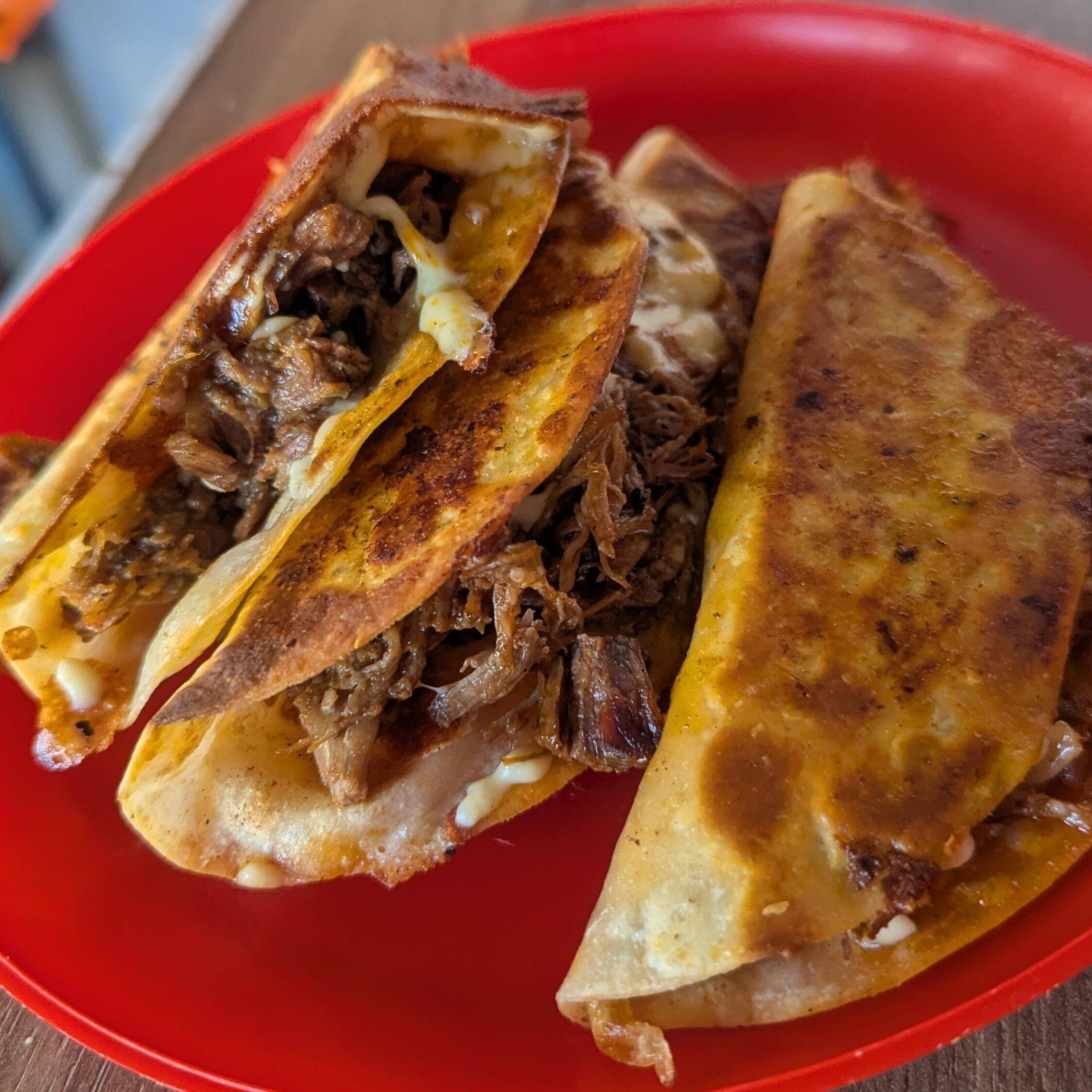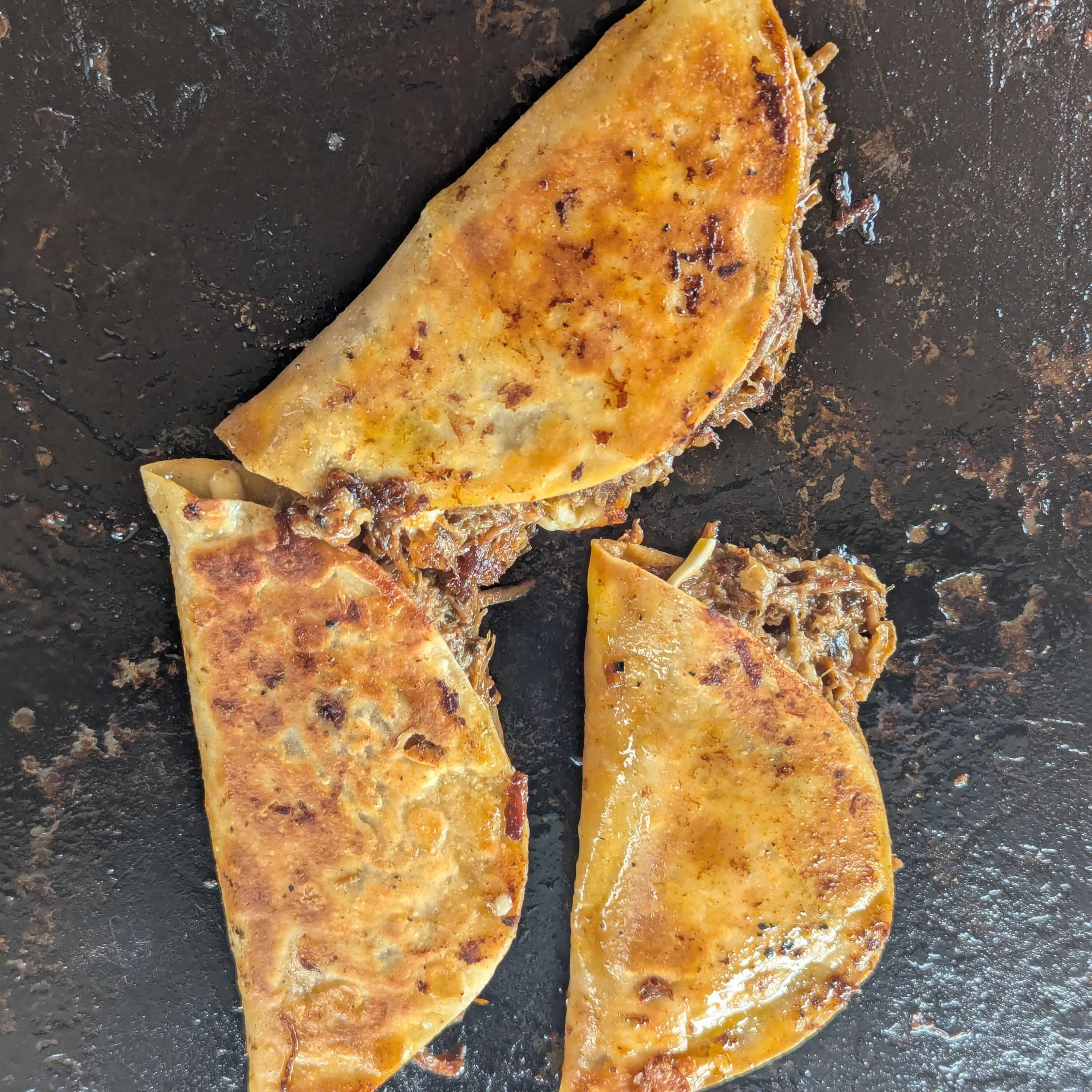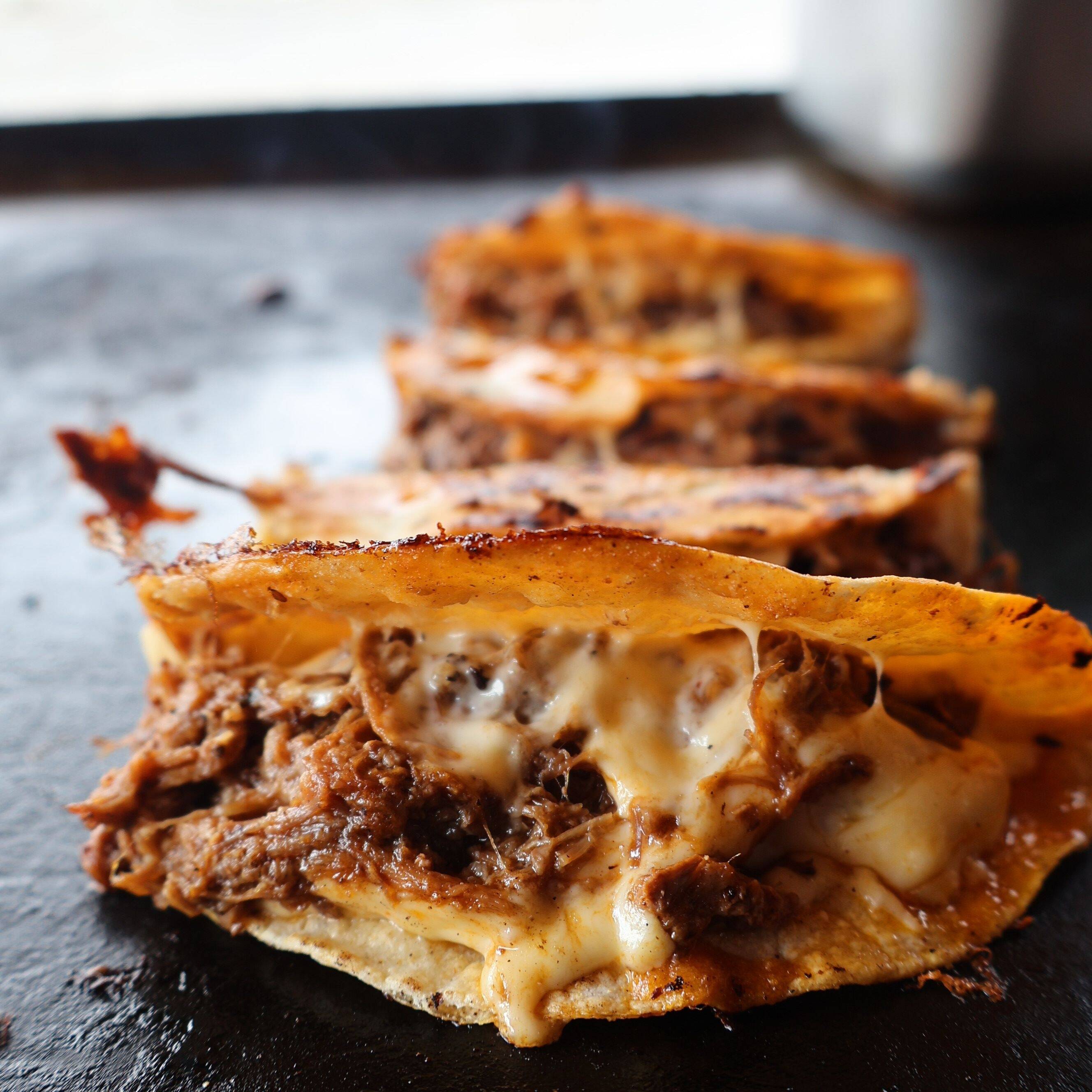 Taco de birria de res jugosita, con mucho queso gratinado, la favorita de casa!