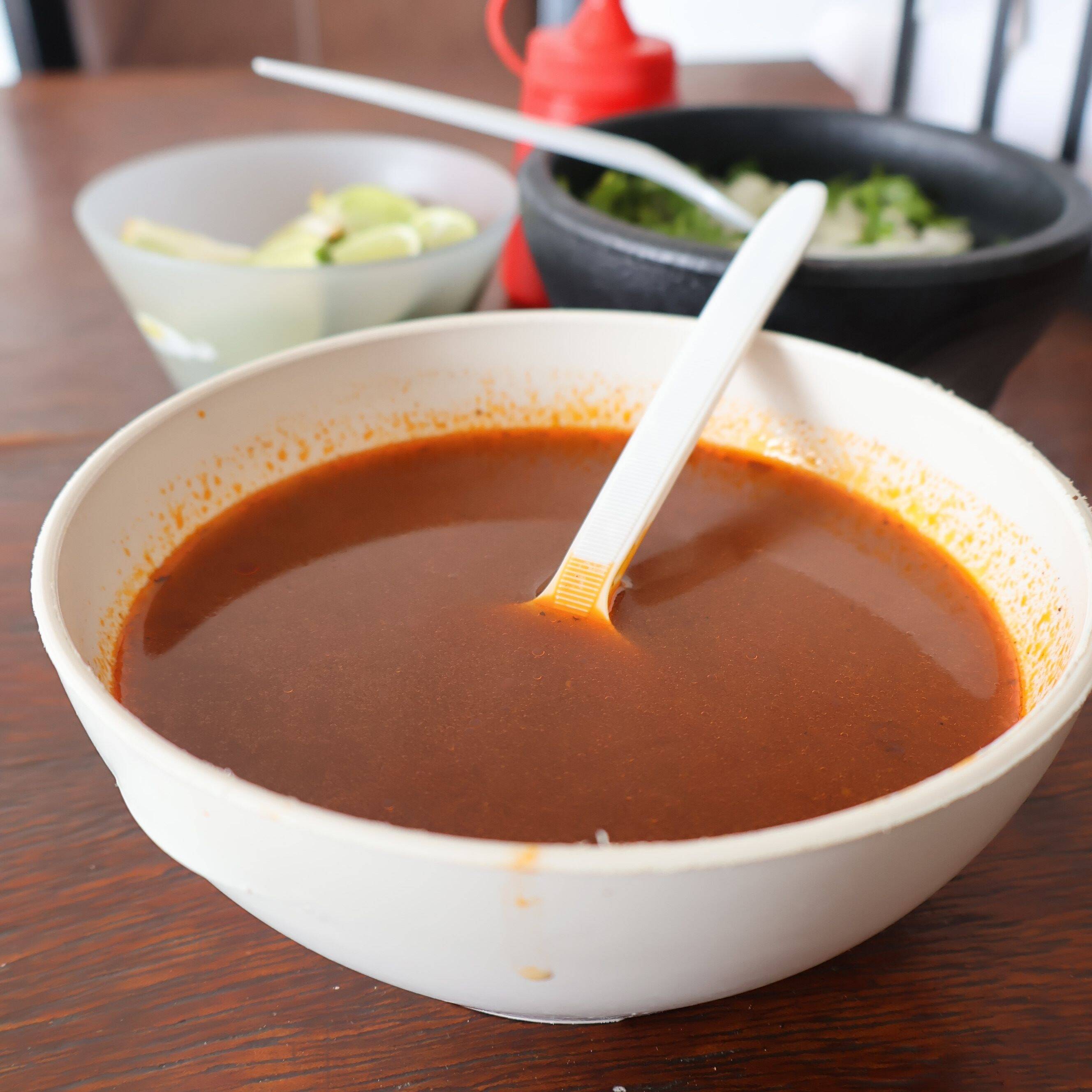 El mejor consomé del condado, con mucha carne y acompañado de tortillas, ideal para crudear y compartir