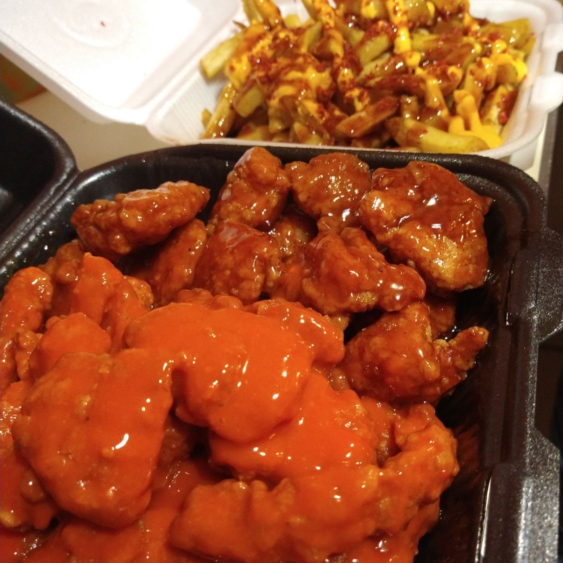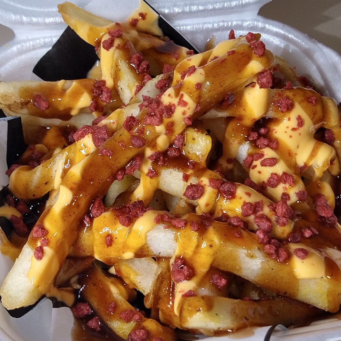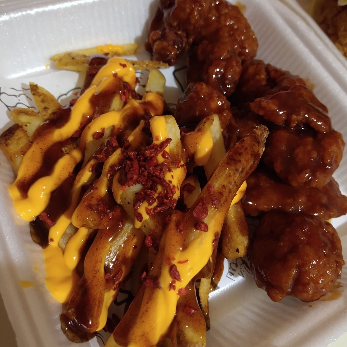 Deliciosas bolitas de pollo crujiente bañadas en búfalo sobre papas ala francesa en salsa ranch.