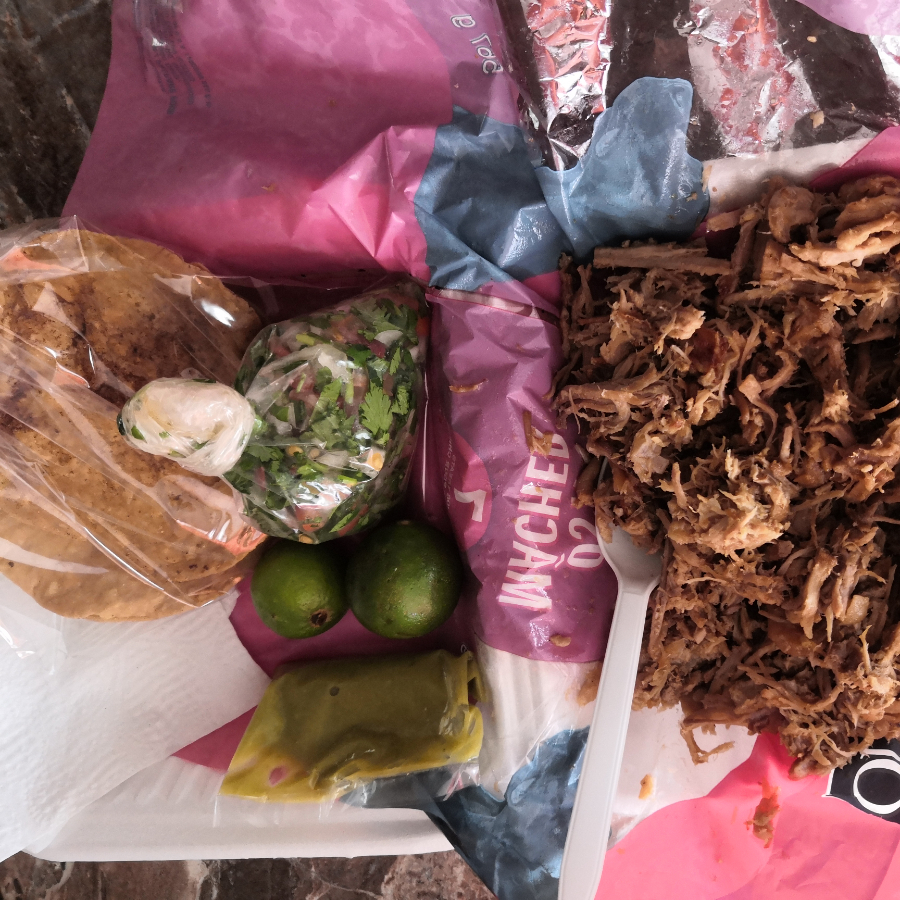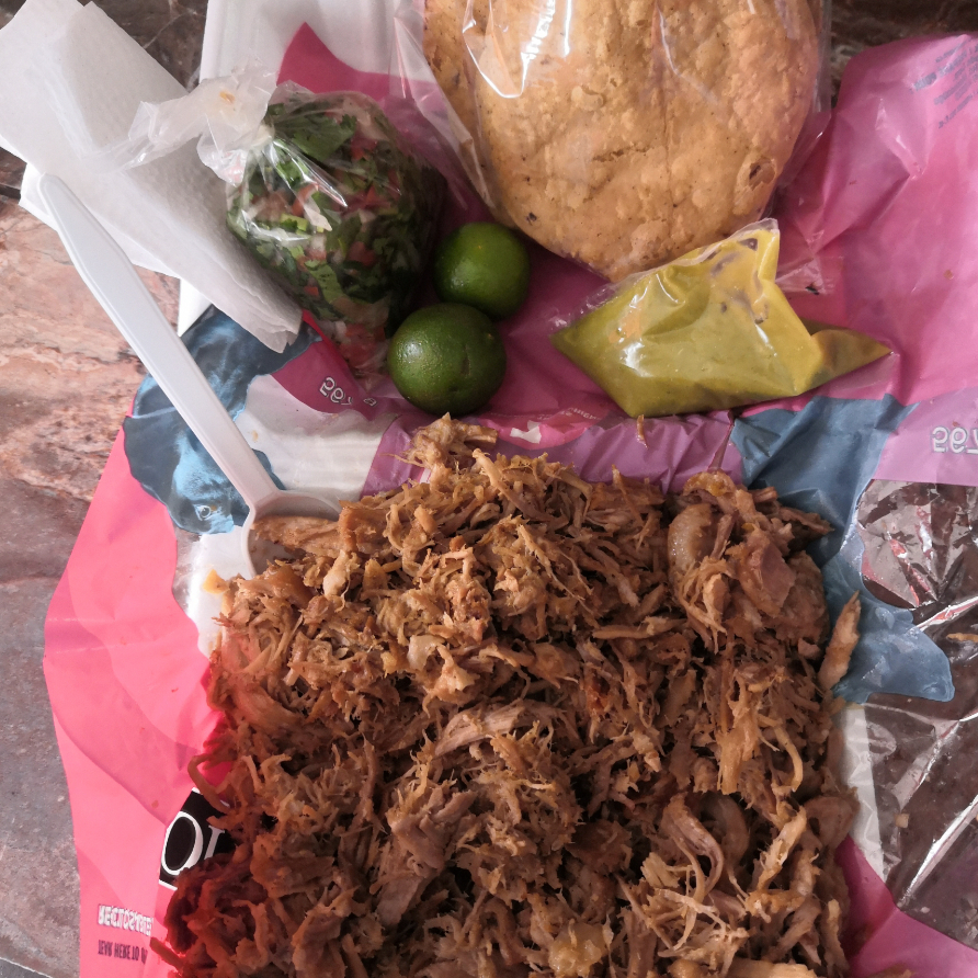 1/4 kg de Carnitas, 3 tostadas, salsa y 1 limón.