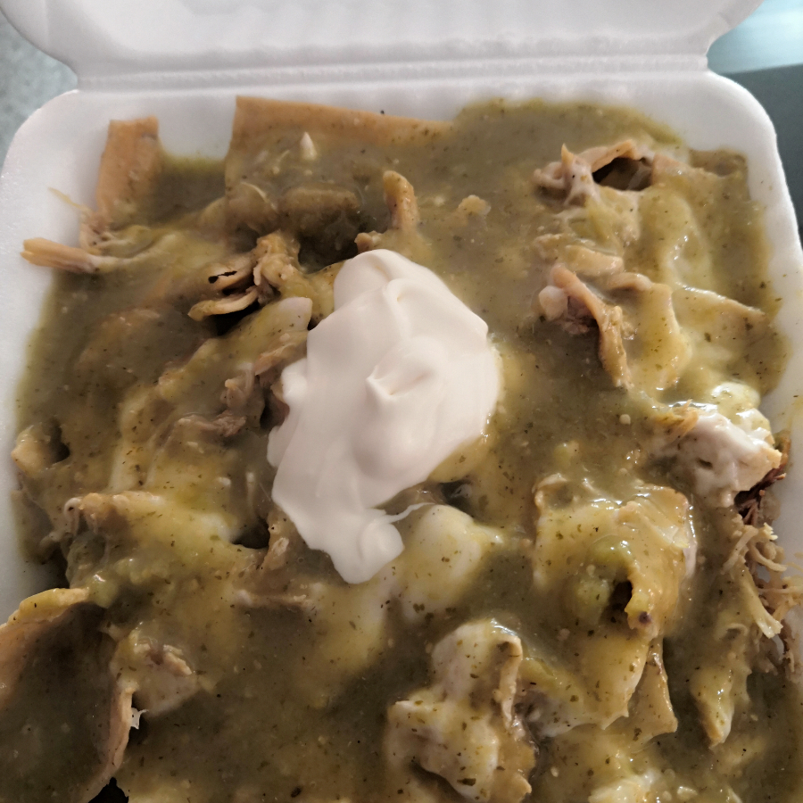 tiras de tortillas doradas, con pollo, bañadas en salsa verde, gratinadas con queso asadero, crema y salsa. (la salsa verde se pone aparte para que no lleguen chorreados con el cliente)