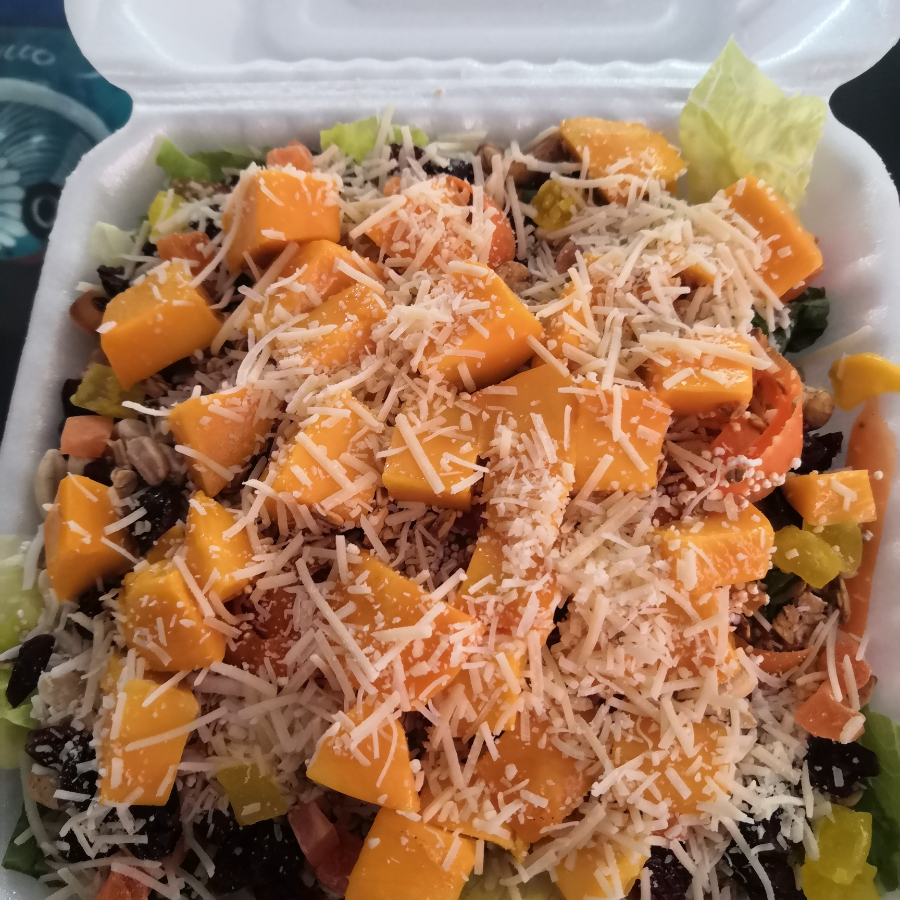 lechuga orejona, zanahoria, mango, arandanos, cacahuates, amaranto, avena tostada, fruta seca de piña y papaya, aderezo de miel con limon y queso parmesano.