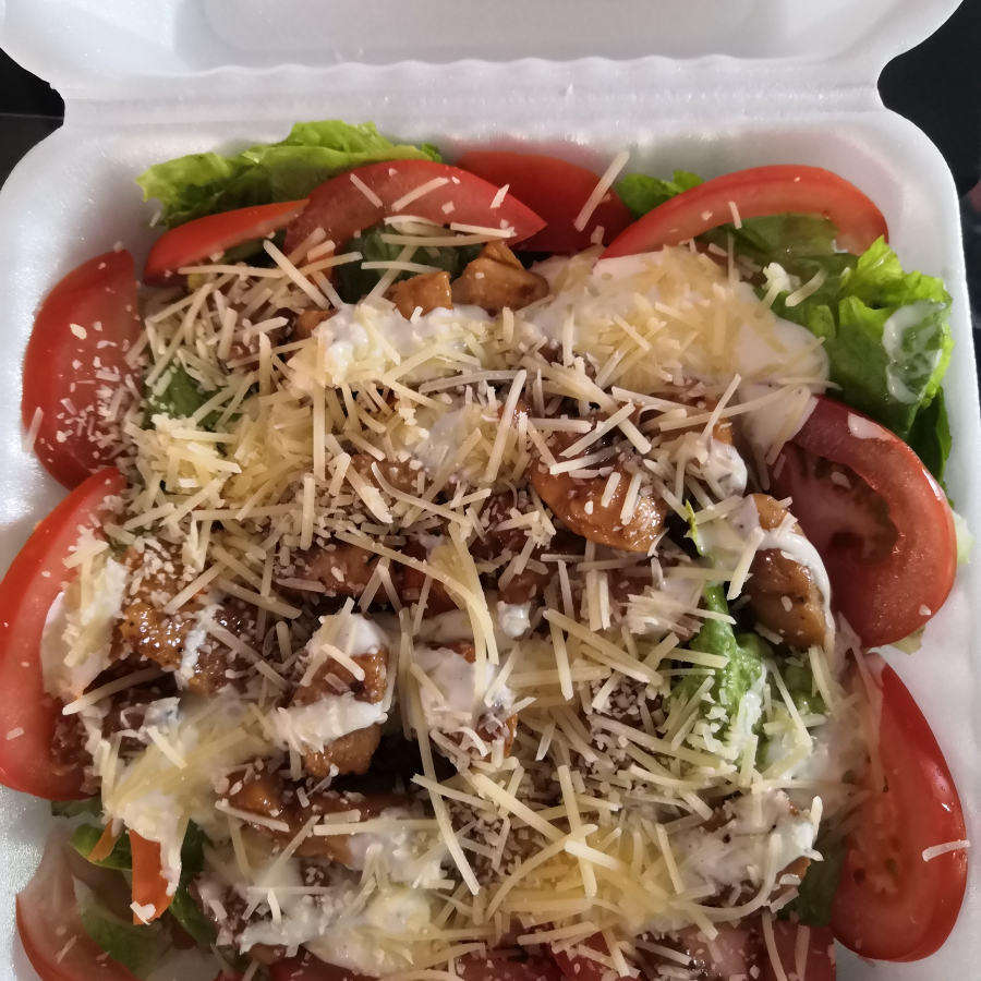 lechuga orejona, zanahoria, tomate, pollo, crotones, aderezo, queso parmesano y salsa)