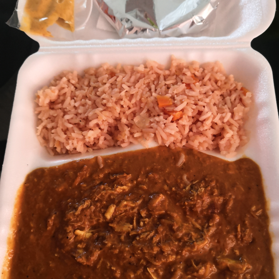 mole rojo de pollo, arroz, tortillas y salsa.