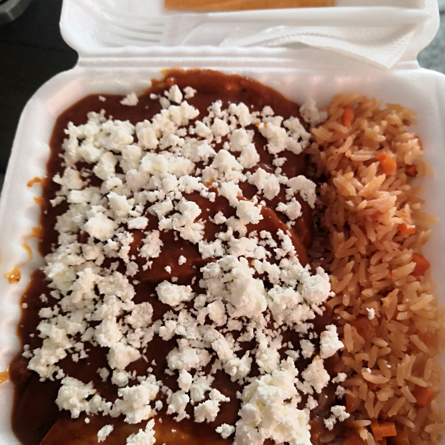 5 pzas, rellenas de pollo sazonado, bañadas en frijoles rojos, con queso panela, arroz y salsa.