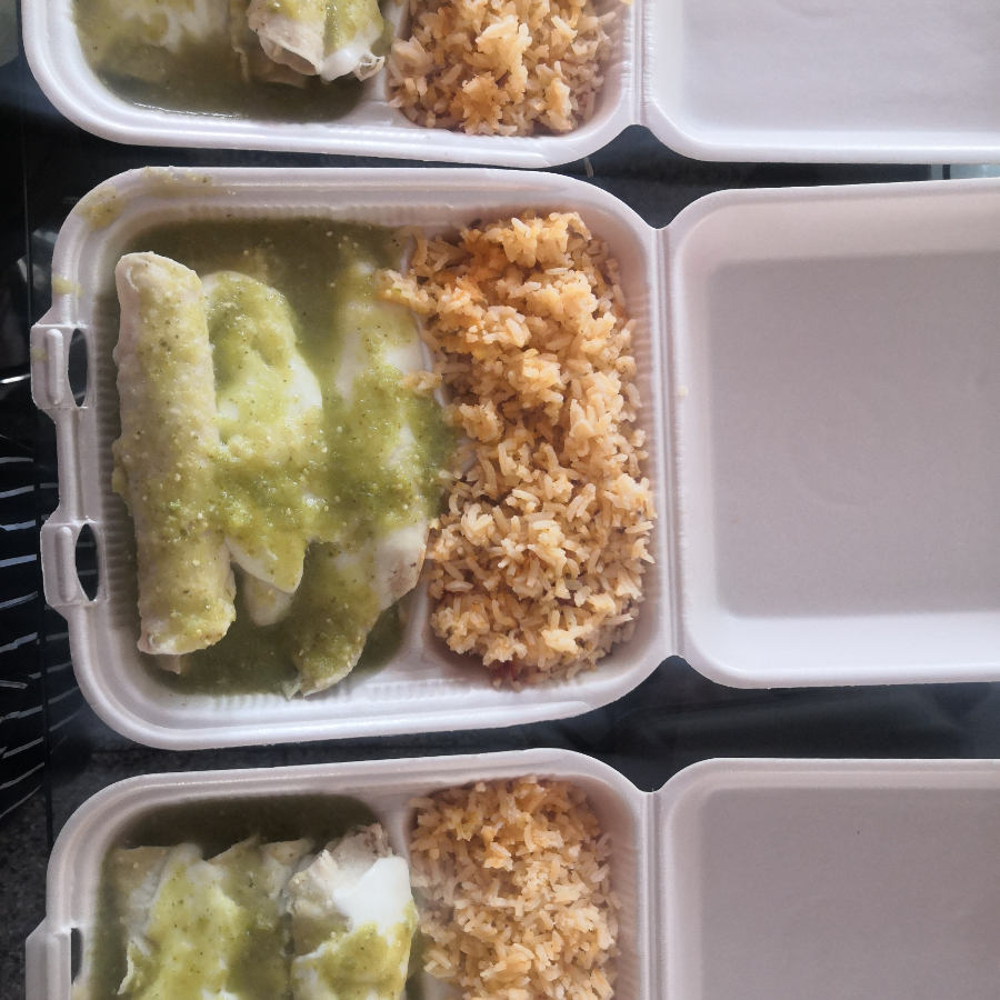 5 pzas de enchiladas suizas bañadas en salsa verde, gratinadas con queso asadero, arroz, crema y salsa.