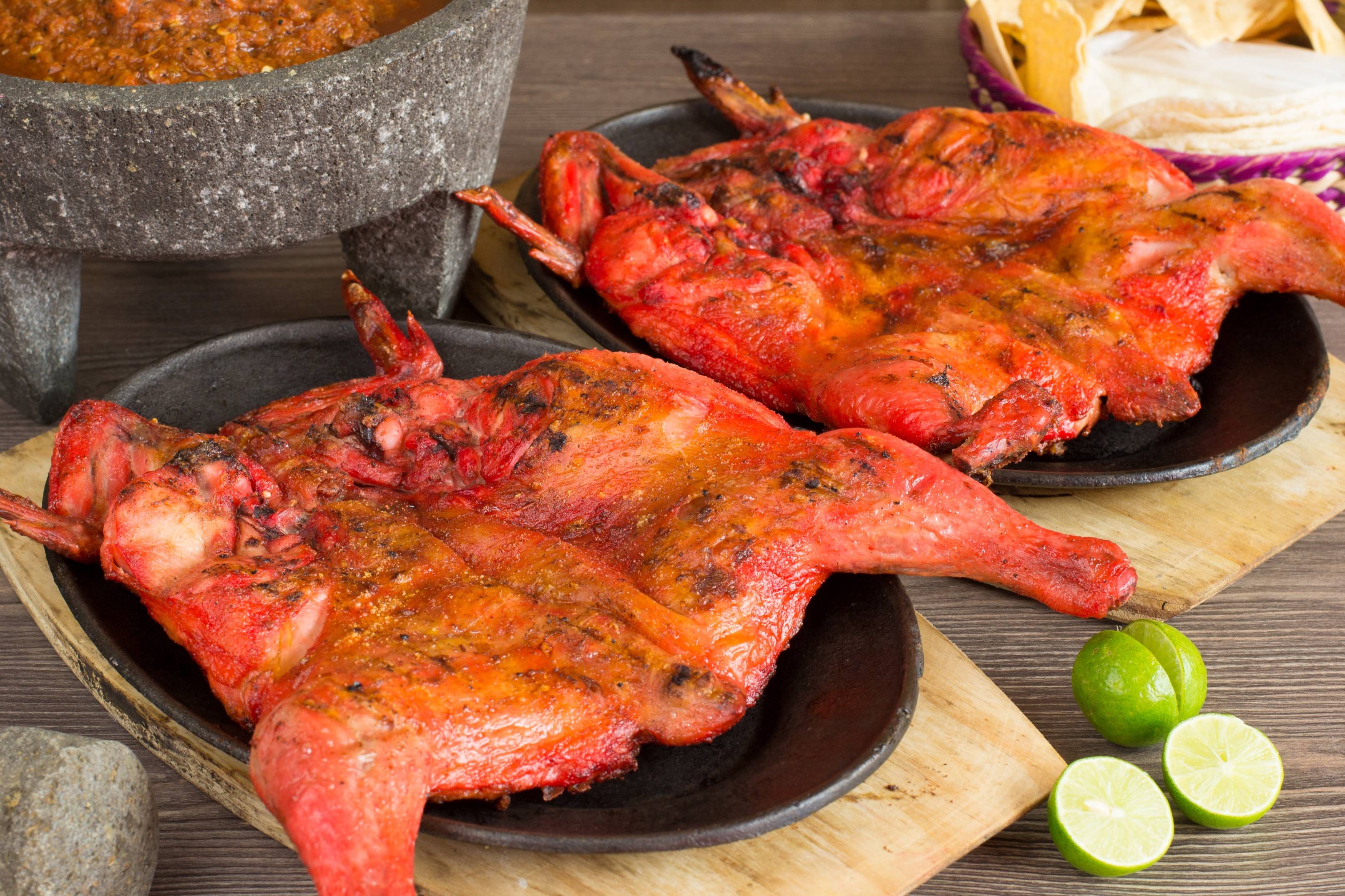 2 Pollos asados al carbón con tortillas y salsas.