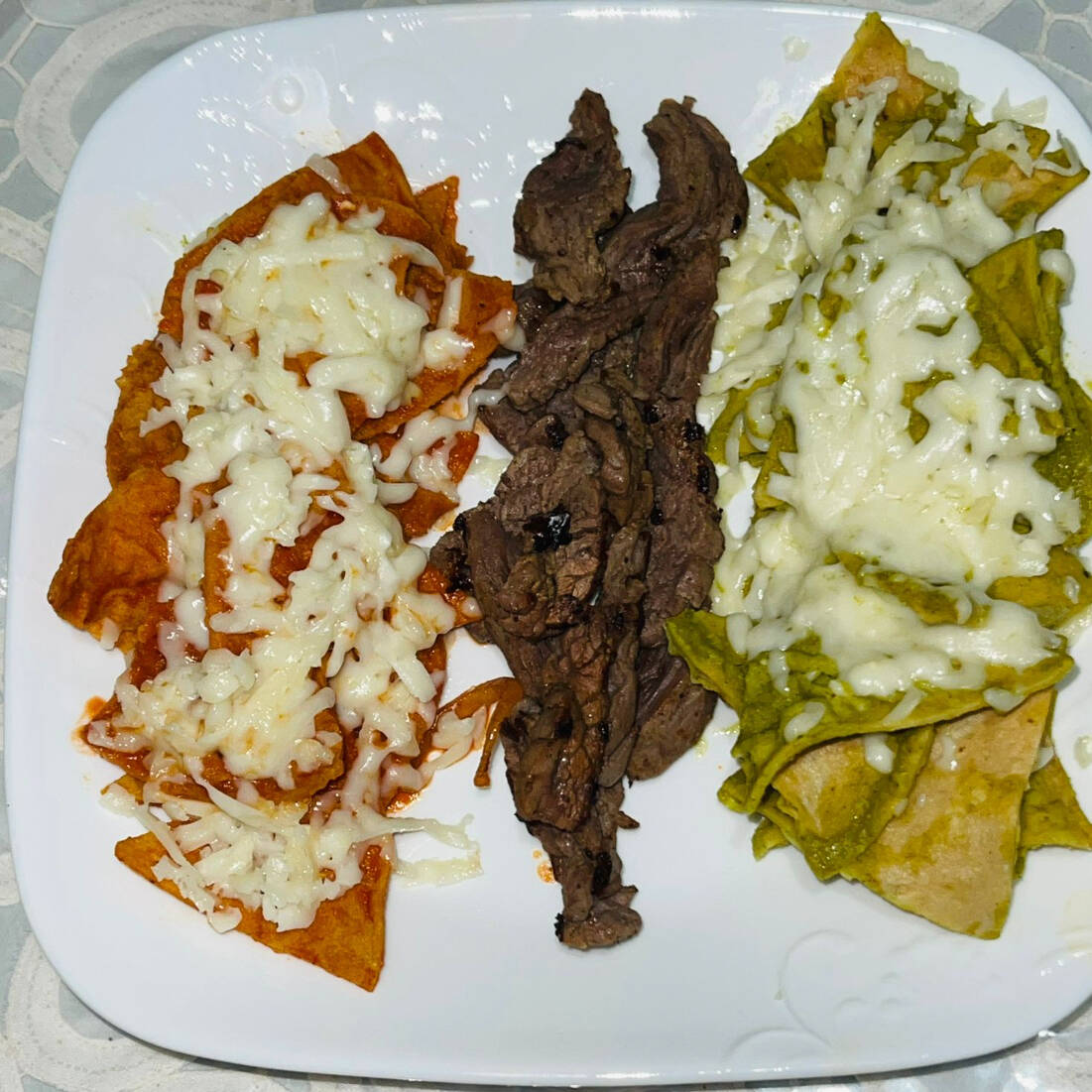 Día tipos de chilaquiles, suizos y del abuelo con arrachera