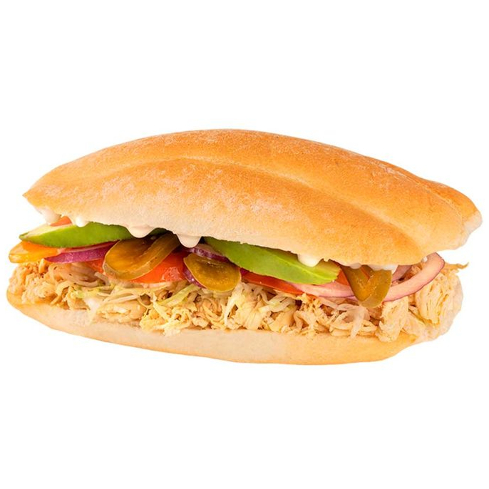 Torta de pierna de cerdo cocinada en sus jugos receta casera, armada con jamon, queso amarillo, cebolla, tomate, catsup, mayonesa y acompañada de sus chilitos en vinagre, ademas de una porcion pequeña de papas fritas