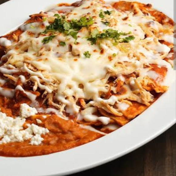 Deliciosos chilaquiles con pechuga de pollo bañados en salsa de chipotle, con frijoles refritos, tortillas de harina
