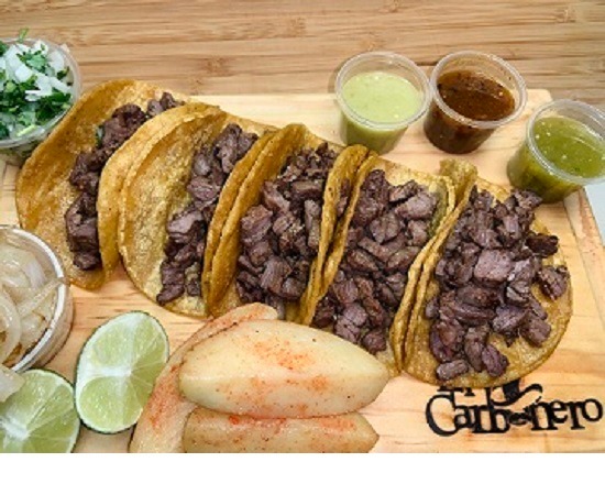 5 Tacos de Carne Asada con morron, cebolla y tocino cocidos en tortilla de maiz acompañados con cebolla asada, salsas, limones y cebolla con cilantro picados.