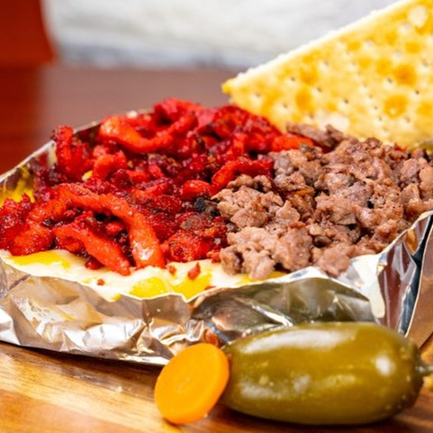 CARNE TROMPO Y RES REVUELTAS CON QUESO SOBRE UNA CAMA DE TORTILLAS DE MAÍZ. ACOMPAÑADO DE UNA PAPA JR.