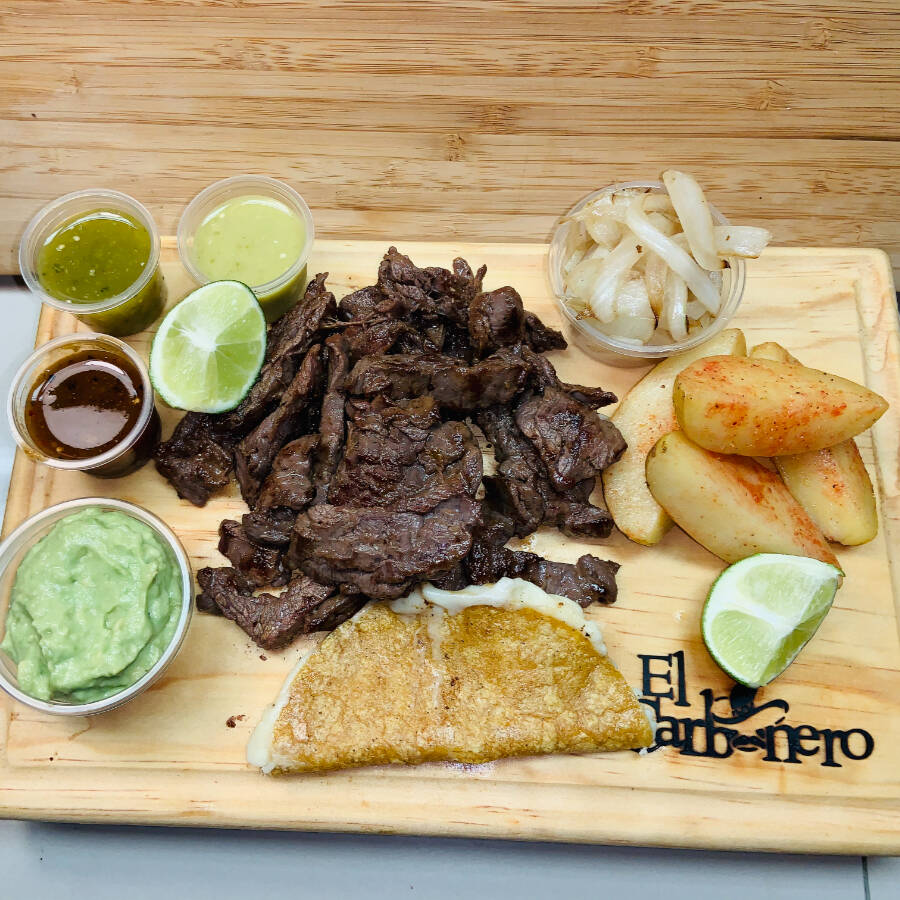CARNE ARRACHERA EN FAJITAS. INCLUYE 10 TORTILLAS DE MAÍZ, 2 QUESADILLAS, 2 FRIJOLES CHARROS, UNA SALCHICHA, CEBOLLA ASADA Y PAPA GALEANA