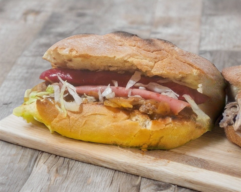 Torta con pan artesanal, carne puerco, queso asadero, jamon, queso, lechuga, tomate y aderezos