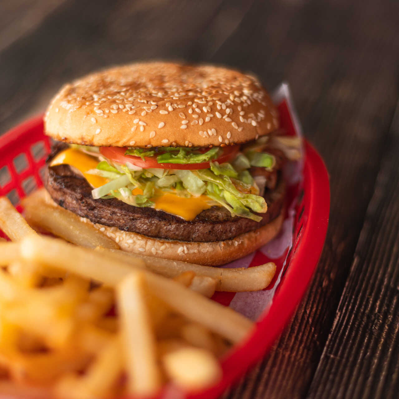 Hamburguesa sencilla con carne y queso + un refresco de tu elección