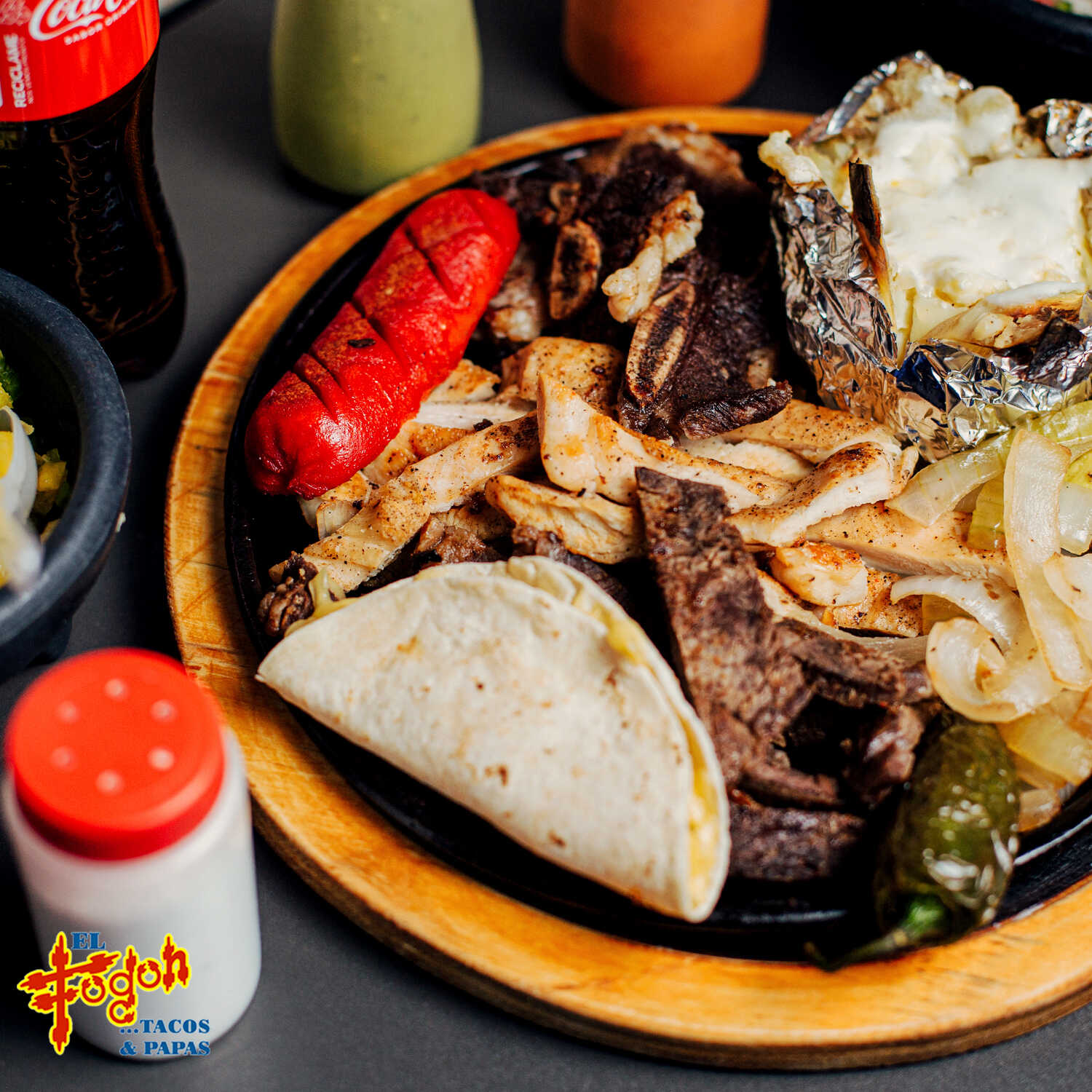 Top sirloin, pollo, frijoles charros, una salchicha, una quesadilla, aguacate, tortillas, cebolla asada y chiles toreados