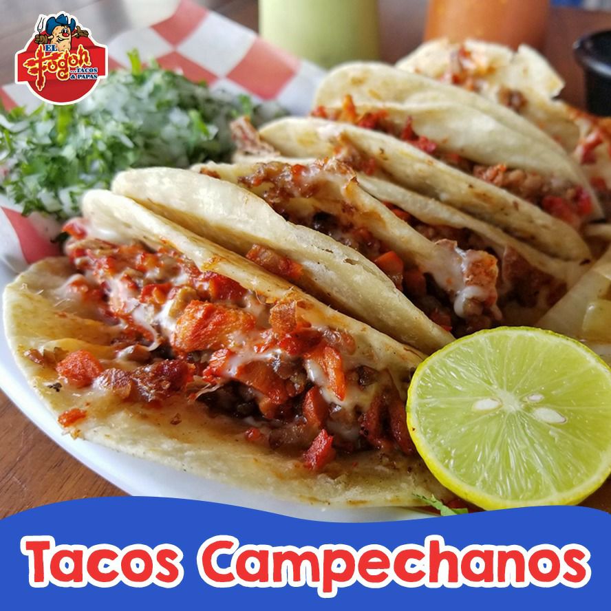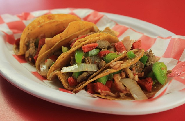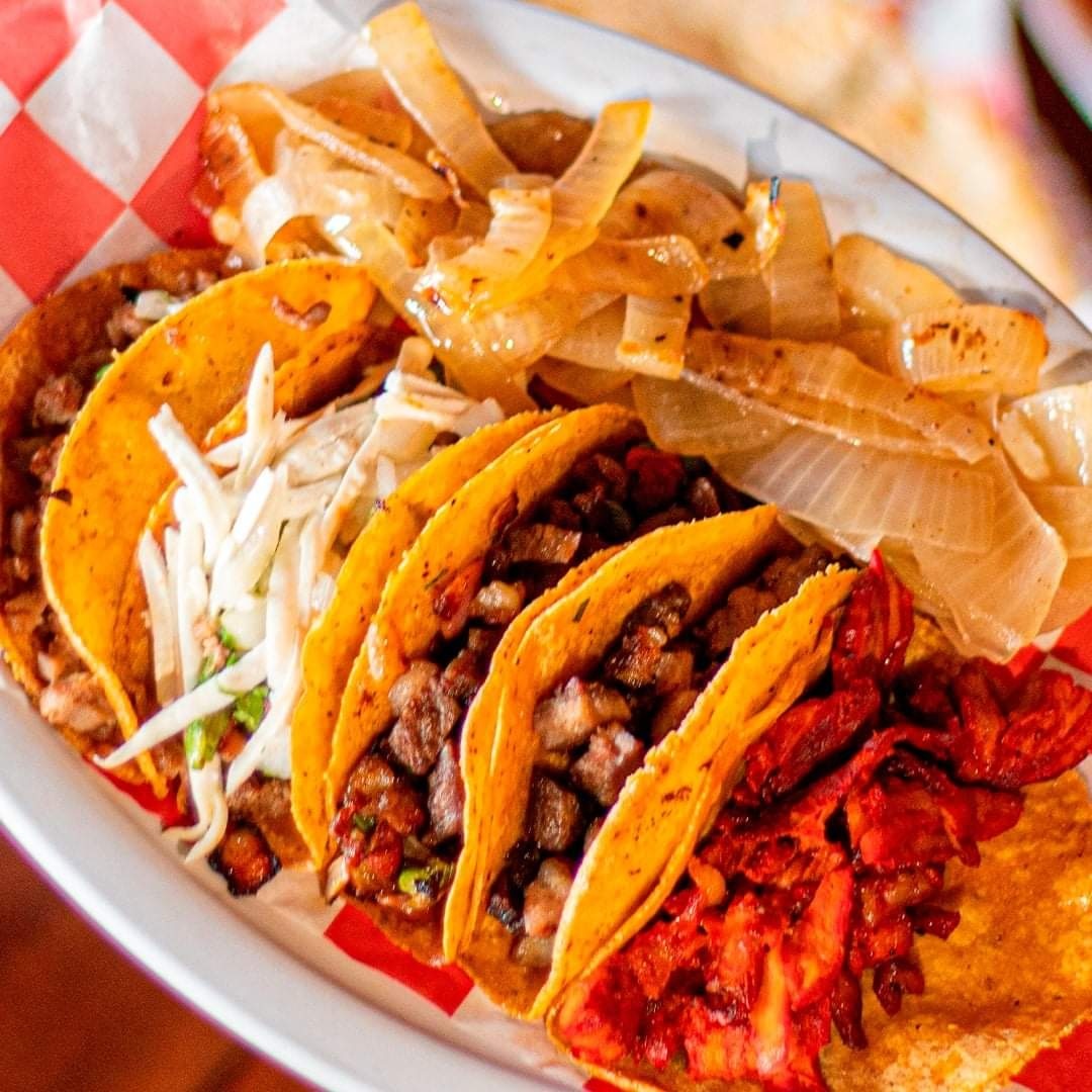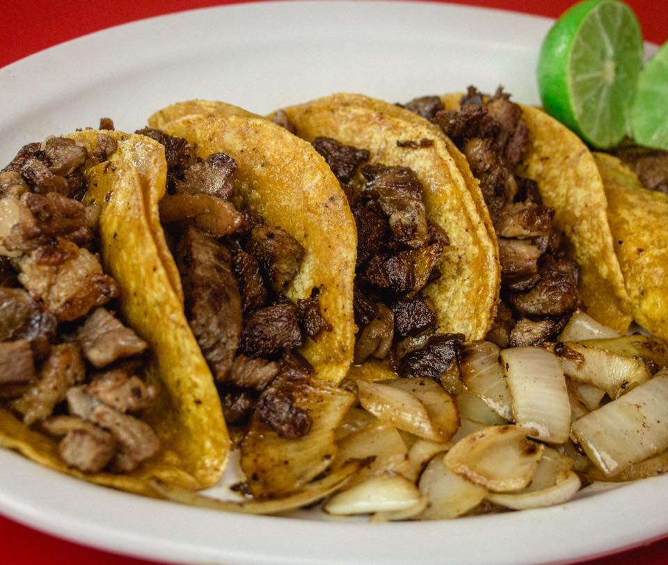 Un taco de bistec, uno de pastor, un taco fogón (milanesa con aguacate y queso rallado), un taco de alambre y un taco de carne asada.