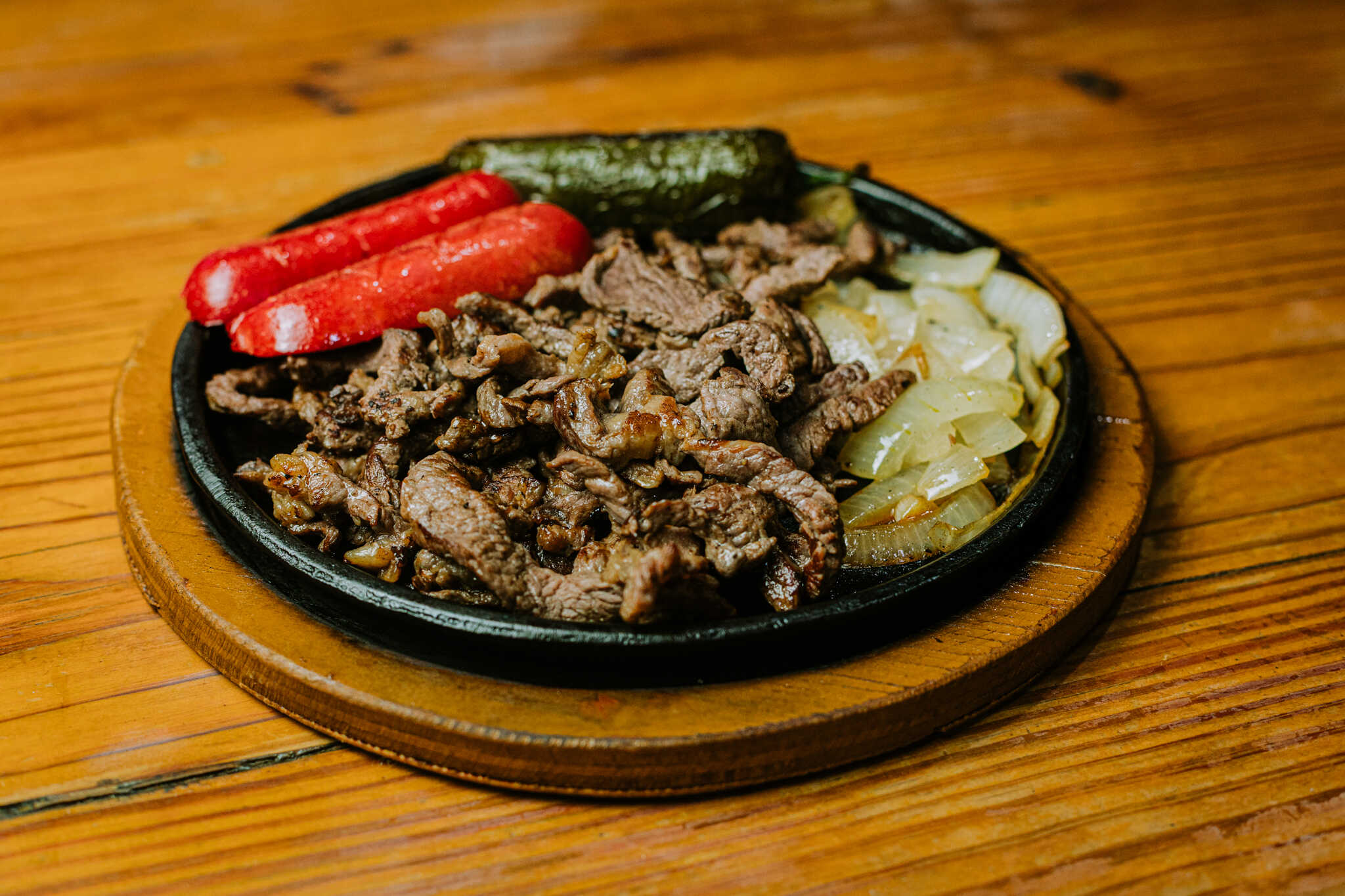 250 gr de sirloin, frijoles charros, salchicha asada, cebolla asada, chiles toreados y tortillas.