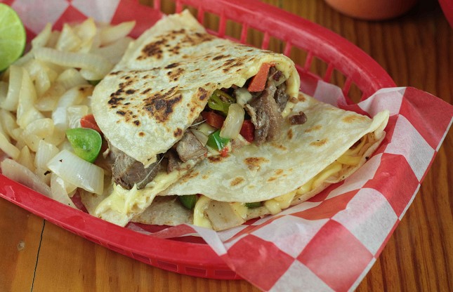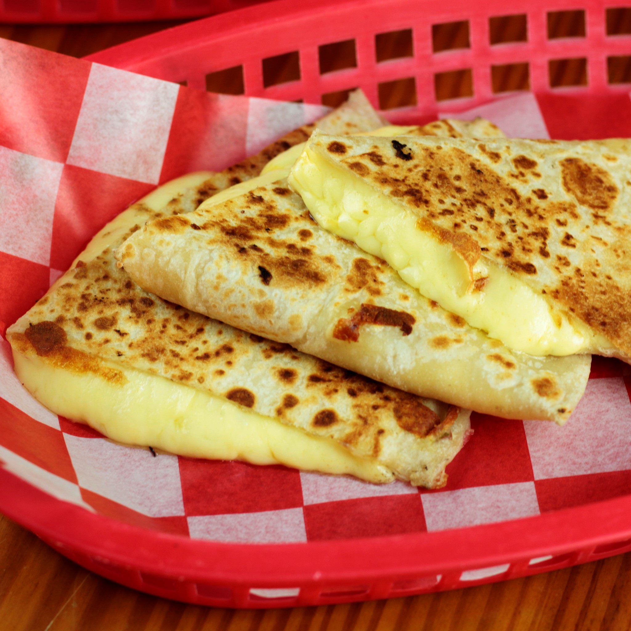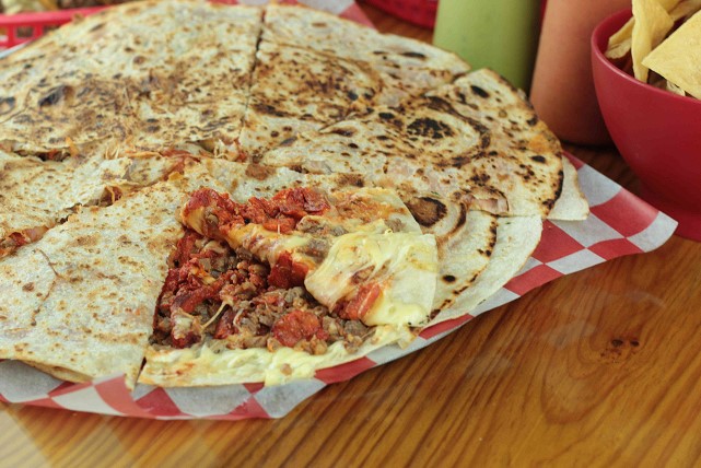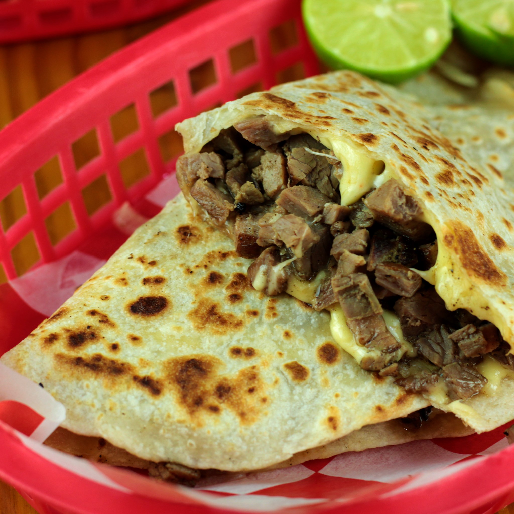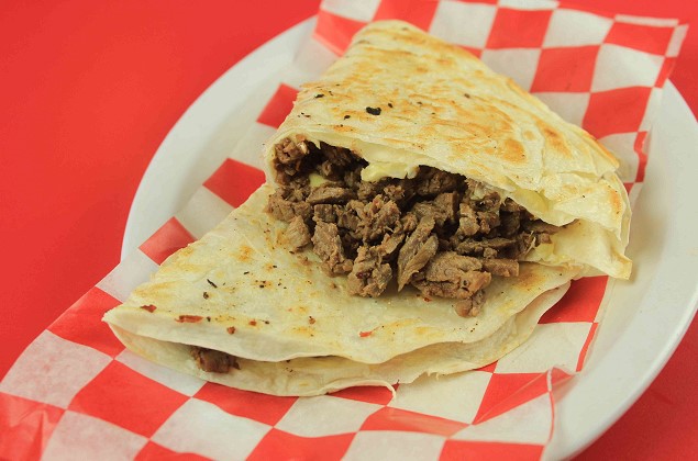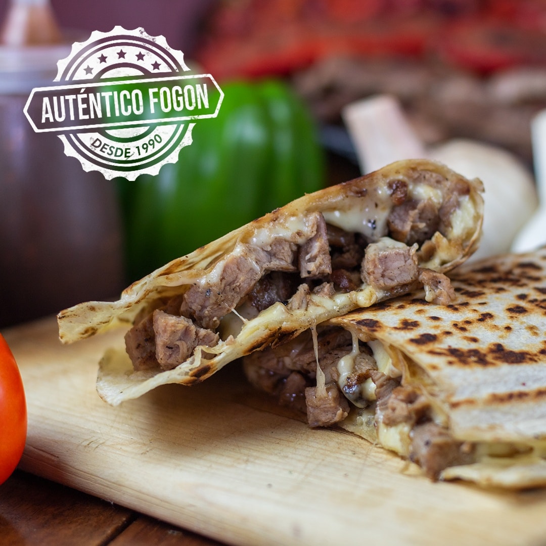 2 tortillas de harina grandes, con bistec, queso y salsa para pizza