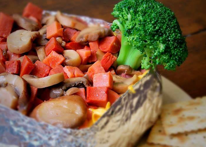 Incluye jamón, salami, salchicha para asar, champiñones y brócoli.