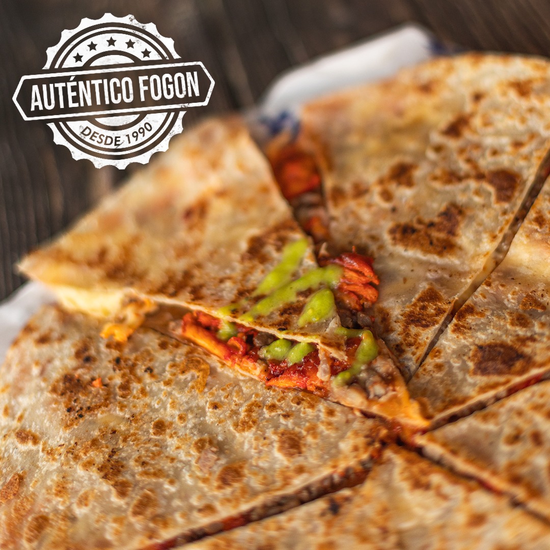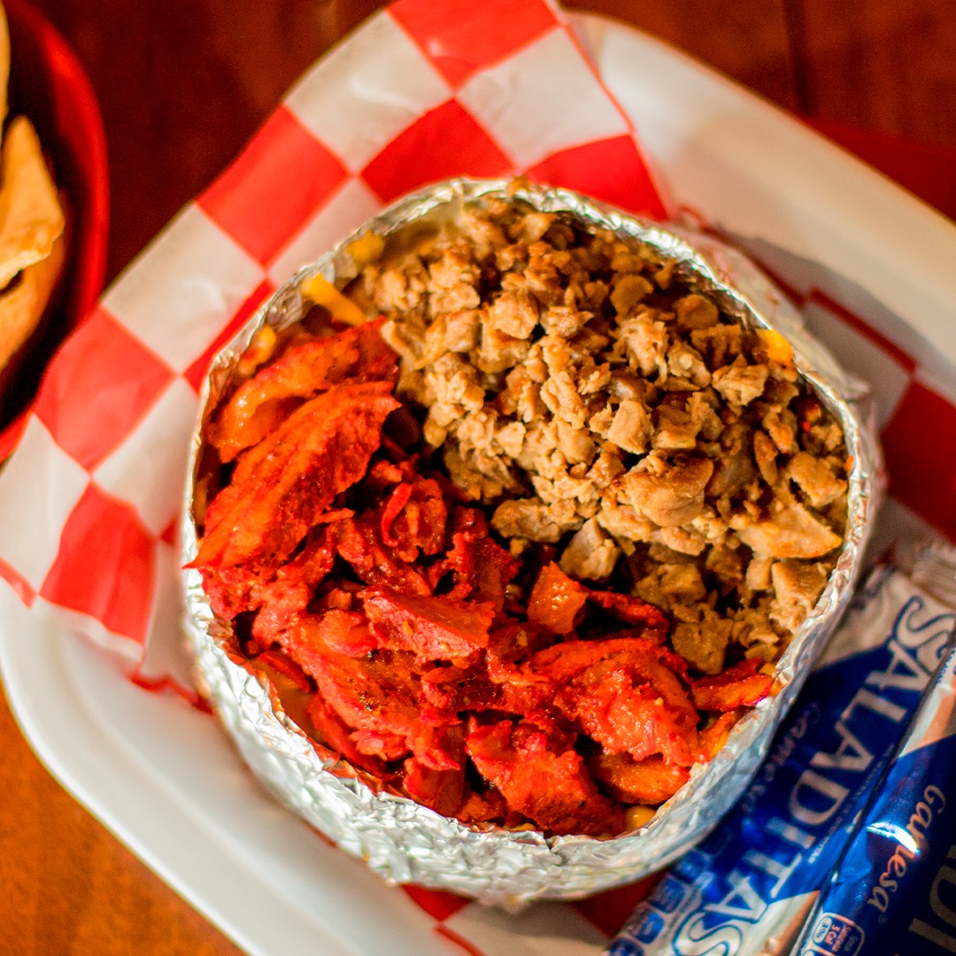 2 toritllas de harina con pastor, bistec, queso y salsa para pizza.